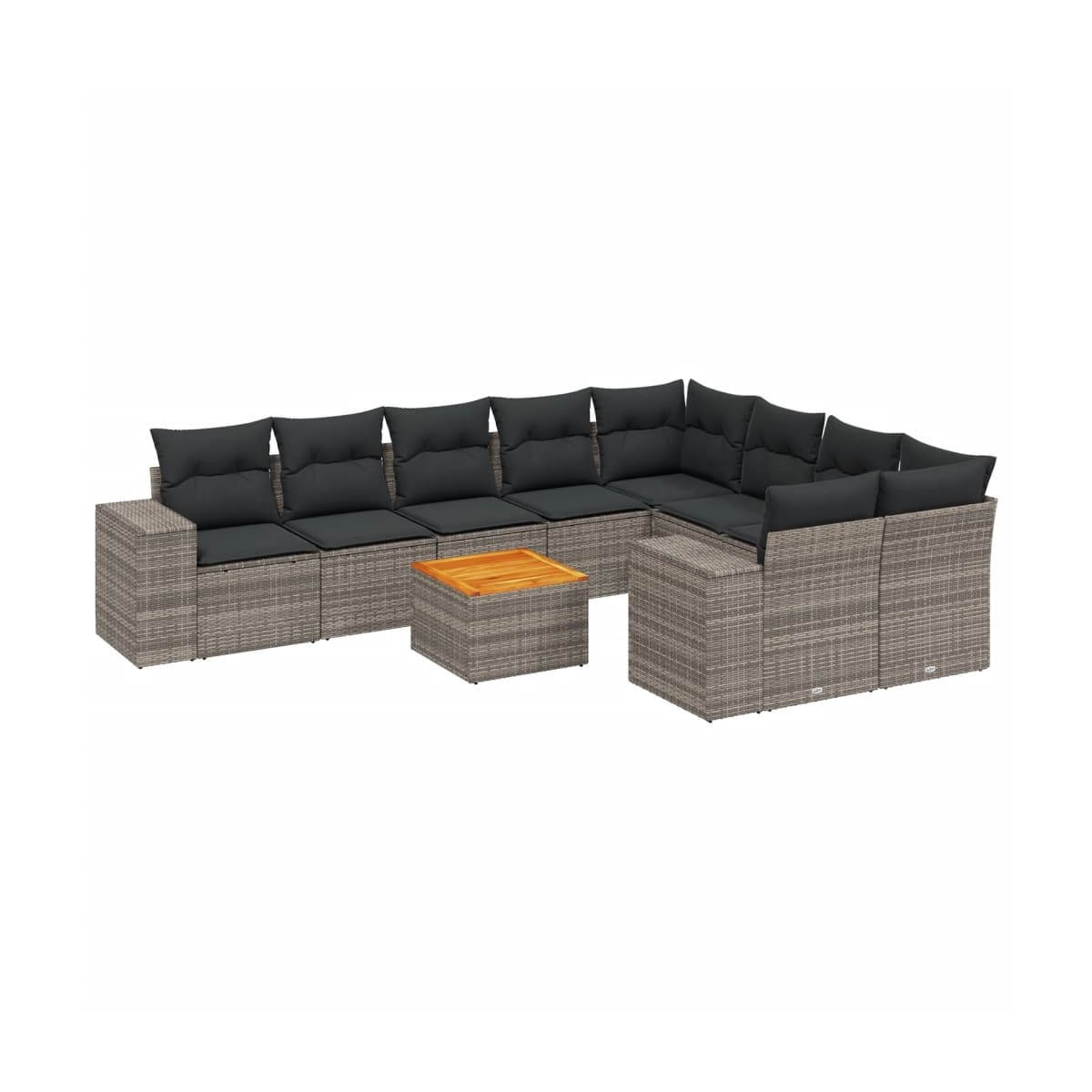Este conjunto de sofás de jardín es el complemento perfecto para el jardín, terraza o patio, ya que proporciona un espacio confortable y acogedor para charlar con familiares y amigos o simplemente relajarte y disfrutar del aire libre. Material duradero: El ratán PE, también conocido como ratán sintético, es un material sintético resistente y de bajo mantenimiento que se parece al ratán natural. Es ligero, fácil de limpiar y se usa comúnmente para muebles de exterior debido a su durabilidad y propiedades resistentes a la intemperie.Superficie estable y fácil de limpiar: Esta mesa de jardín tiene una superficie de madera de acacia que es resistente, duradero y fácil de limpiar con un paño húmedo. Función de almacenaje con bolsa impermeable: Cada asiento de jardín cuenta con espacio de almacenamiento debajo del asiento, completo con una bolsa resistente al agua para guardar cojines, juguetes y otros artículos. Las bolsas interiores tienen una cubierta superior y pueden fijarse firmemente a los asientos con cierres adhesivos para mayor estabilidad.Experiencia de asiento cómoda: Estos muebles de exterior, completos con cojines acolchados gruesos, ofrecen una experiencia de asiento cómoda.Diseño modular: Este conjunto de muebles de exterior tiene un diseño modular, por lo que es completamente flexible y fácil de mover, para que puedas crear una disposición de muebles de exterior personalizada. Información útil:Para asegurarte de que tus muebles de exterior se mantengan hermosos, recomendamos protegerlos con una funda impermeable.