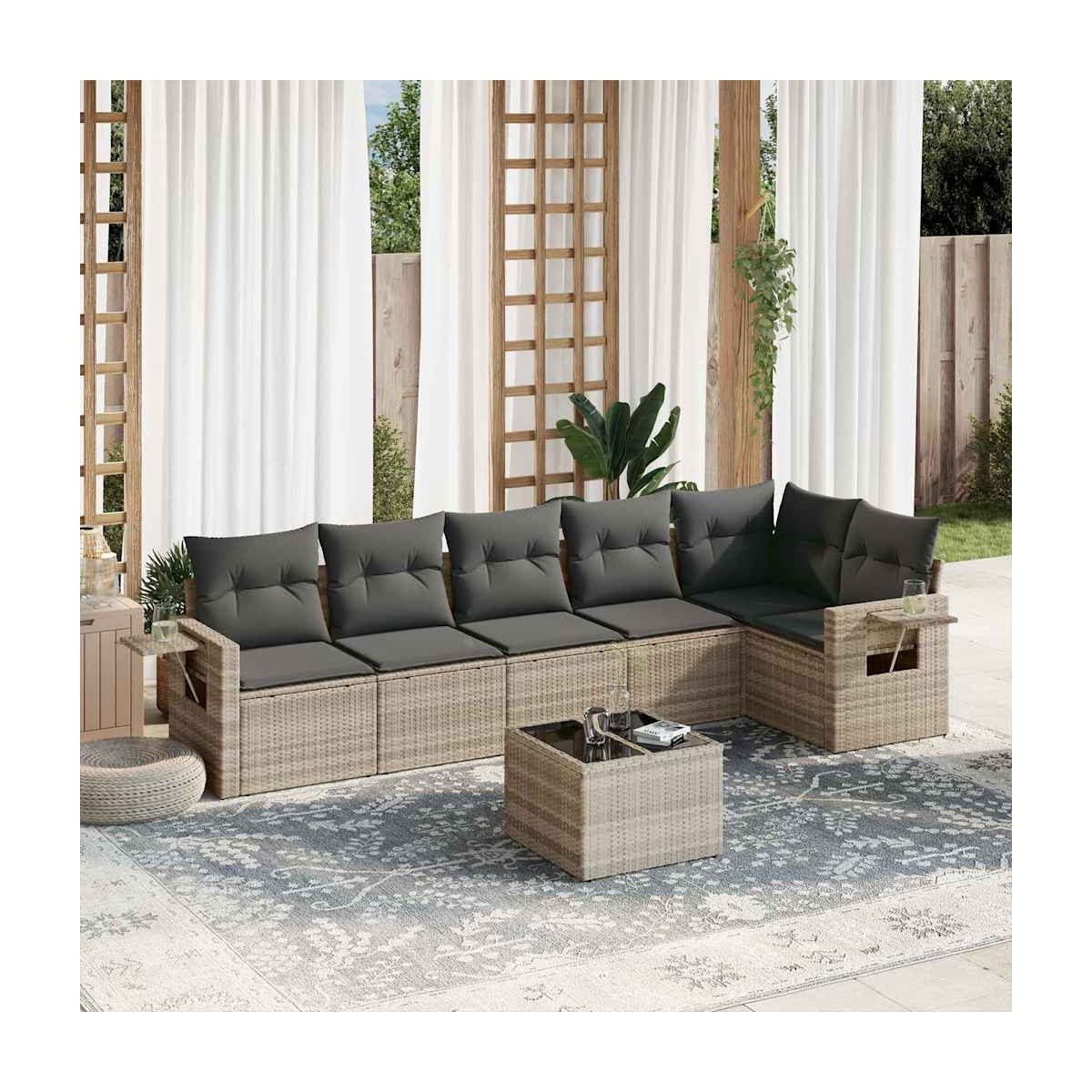 Este conjunto de sofás de jardín es el complemento perfecto para el jardín, terraza o patio, ya que proporciona un espacio confortable y acogedor para charlar con familiares y amigos o simplemente relajarte y disfrutar del aire libre. Material duradero: El ratán PE, también conocido como ratán sintético, es un material sintético resistente y de bajo mantenimiento que se parece al ratán natural. Es ligero, fácil de limpiar y se usa comúnmente para muebles de exterior debido a su durabilidad y propiedades resistentes a la intemperie.Superficie de vidrio: La superficie de la mesa de exterior es de vidrio templado resistente y duradero, por lo que es fácil de limpiar con un paño húmedo y añade un toque de elegancia a tu espacio exterior. Práctica mesa auxiliar: Este mueble de exterior cuenta con una mesa auxiliar plegable con un resorte de gas en los reposabrazos, lo que proporciona un lugar conveniente para mantener tus elementos esenciales al alcance de la mano. Experiencia de asiento cómoda: Estos muebles de exterior, completos con cojines acolchados gruesos, ofrecen una experiencia de asiento cómoda.Diseño modular: Este conjunto de muebles de exterior tiene un diseño modular, por lo que es completamente flexible y fácil de mover, para que puedas crear una disposición de muebles de exterior personalizada. Información útil:Para asegurarte de que tus muebles de exterior se mantengan hermosos, recomendamos protegerlos con una funda impermeable.