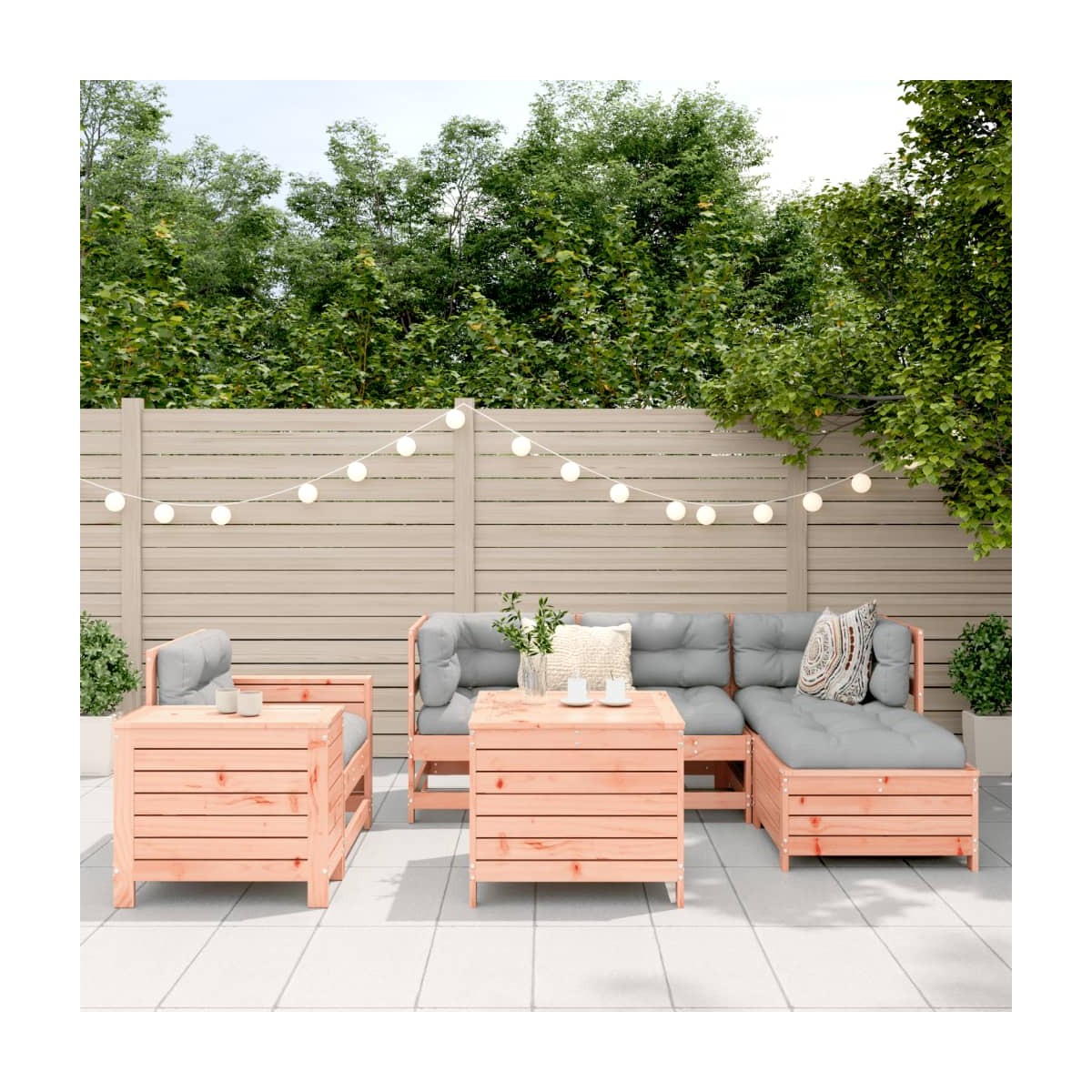 Este juego de sofás de jardín de madera, con un diseño de listones, será un gran complemento para el jardín, el patio o la terraza, para poder disfrutar de un rato agradable con la familia o los amigos. Material resistente y duradero: La madera de abeto Douglas es conocida por su resistencia y durabilidad. Su intenso color marrón rojizo y su veteado único transmiten un ambiente cálido y natural. Con una buena estabilidad y resistencia a la intemperie, es ideal para fabricar muebles de interior y exterior. Buena ventilación y prevención de encharcamientos: El diseño de rejilla favorece un flujo de aire óptimo y evita eficazmente la acumulación de agua, lo que garantiza un asiento seco y cómodo. Uso versátil: El taburete de jardín no solo se puede usar para sentarse o relajar los pies, sino que también se puede usar como mesa de centro para guardar bebidas, comida y otros adornos. Mesa práctica: La mesa de jardín te ofrece un lugar práctico para guardar tus objetos esenciales con facilidad. Diseño modular: Este conjunto de muebles de exterior tiene un diseño modular, por lo que es completamente flexible y fácil de mover, para que puedas crear una disposición de muebles de exterior personalizada. Información útil:Para asegurarte de que tus muebles de exterior se mantengan hermosos, recomendamos protegerlos con una funda impermeable.