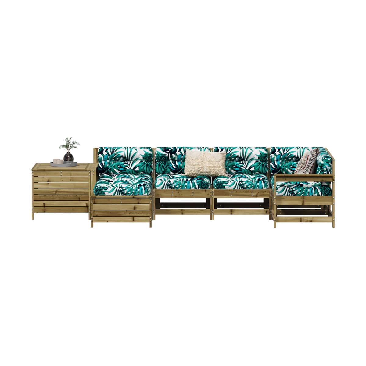 Este juego de sofás de jardín de madera, con un diseño de listones, será un gran complemento para el jardín, el patio o la terraza, para poder disfrutar de un rato agradable con la familia o los amigos. Material resistente y duradero: La madera maciza de pino es conocida por su resistencia y durabilidad. Sus vetas rectas y nudos característicos contribuyen a su encanto rústico. Se ha impregnado con una solución conservante y se ha sometido a un tratamiento en autoclave, lo que ha mejorado su resistencia al deterioro y a la intemperie. Buena ventilación y prevención de encharcamientos: El diseño de rejilla favorece un flujo de aire óptimo y evita eficazmente la acumulación de agua, lo que garantiza un asiento seco y cómodo. Uso versátil: El taburete de jardín no solo se puede usar para sentarse o relajar los pies, sino que también se puede usar como mesa de centro para guardar bebidas, comida y otros adornos. Mesa práctica: La mesa de jardín te ofrece un lugar práctico para guardar tus objetos esenciales con facilidad. Diseño modular: Este conjunto de muebles de exterior tiene un diseño modular, por lo que es completamente flexible y fácil de mover, para que puedas crear una disposición de muebles de exterior personalizada. Información útil:Para asegurarte de que tus muebles de exterior se mantengan hermosos, recomendamos protegerlos con una funda impermeable.