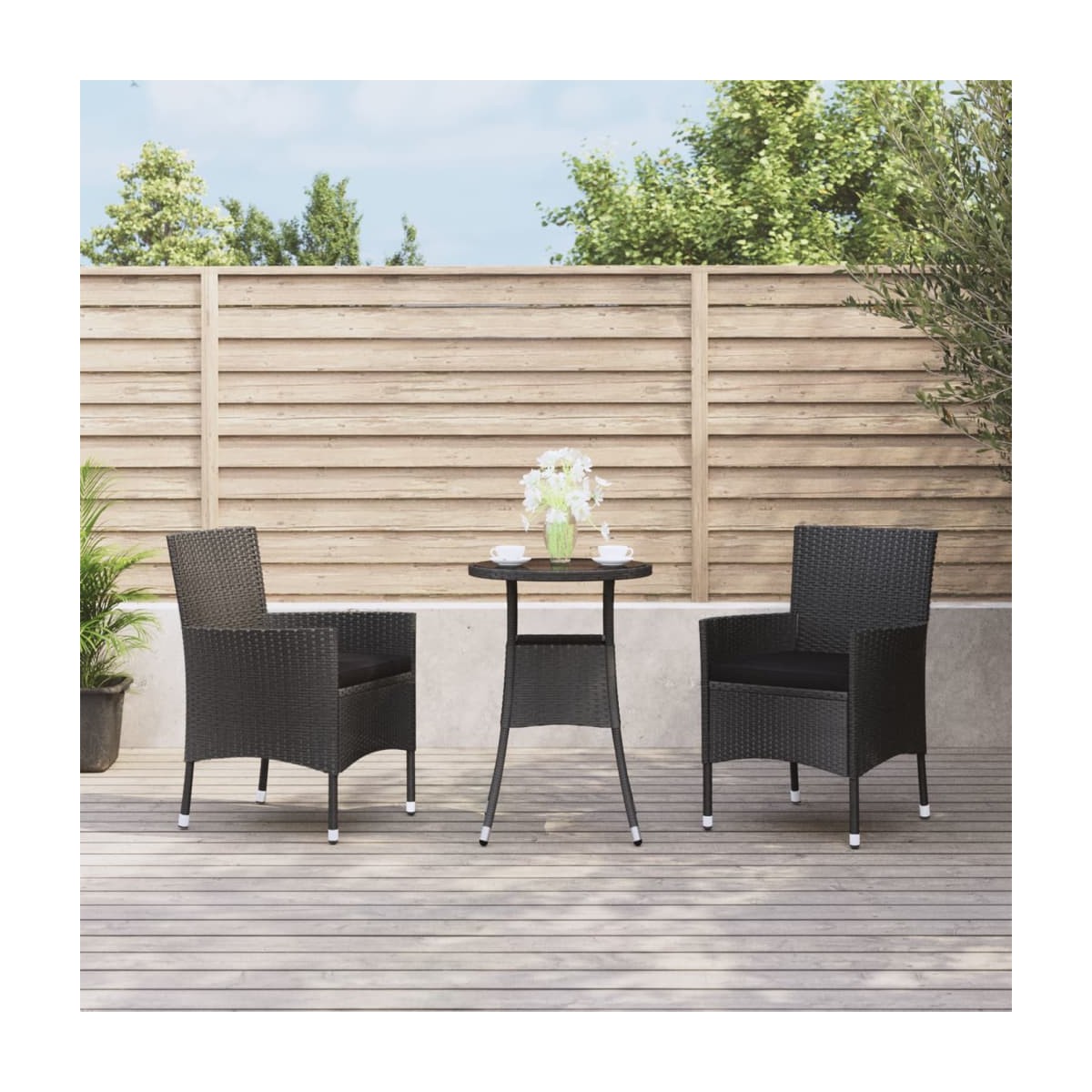 Este elegante juego de muebles para el jardín te brinda momentos agradables y cómodos con tu familia y tus amigos. Material duradero: El ratán PE, también conocido como ratán sintético, es resistente a la intemperie y fácil de limpiar. La parte exterior se mantiene hermosa durante mucho tiempo. Ofrece una gran calidad, comodidad y aspecto estético. Estructura resistente y estable: La estructura de acero con recubrimiento en polvo del conjunto de muebles de jardín garantiza su solidez y estabilidad. Asiento cómodo: Diseñadas con reposabrazos y respaldos, estas sillas de cafetería para jardín proporcionan la máxima comodidad. Los cojines acolchados de las sillas de terraza también ofrecen un plus de confort al sentarte. Superficie robusta: La robusta superficie de la mesita es perfecta para colocar comidas, bebidas, jarrones, fruteros u otros objetos decorativos. Nota:Para asegurarte de que tus muebles de exterior se mantengan hermosos, recomendamos protegerlos con una funda impermeable.