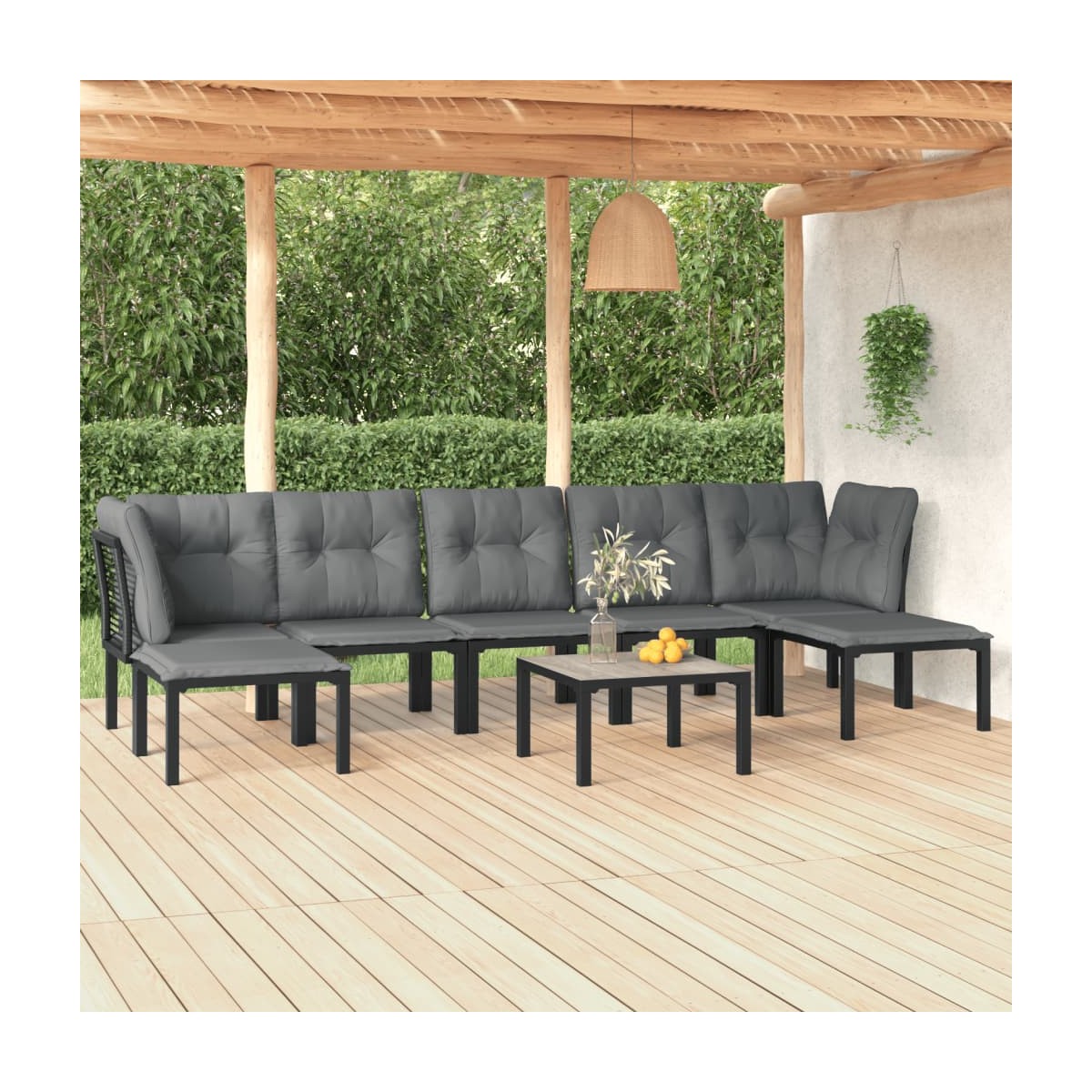 Este elegante conjunto de muebles de jardín presenta un diseño elegante y moderno, que es una gran opción para relajarse en el jardín. Material resistente a la intemperie: El ratán PE, también conocido como ratán sintético, es resistente a la intemperie y fácil de limpiar. La parte exterior se mantiene hermosa durante mucho tiempo. Ofrece una gran calidad, comodidad y aspecto estético. Estructura robusta y estable: La estructura de acero con recubrimiento en polvo del juego de muebles garantiza su solidez y estabilidad.Cómodo asiento: El respaldo aporta un plus de comodidad al sentarse. Además, los cojines gruesos y acolchados proporcionan comodidad al asiento.Diseño modular: El juego de muebles para exteriores es flexible y fácil de mover, por lo que puedes combinarlo con otros segmentos modulares de la tienda web para crear tus propias configuraciones personales de muebles de jardín.Mesa práctica: La robusta superficie de la mesa de centro para jardín es perfecta para colocar comidas, bebidas y artículos decorativos.Práctico reposapiés: El taburete sirve para descansar los pies y relajarte, y también te ofrece un asiento de más en el jardín. Información útil:Para facilitar al máximo el montaje, cada producto se entrega con un manual.Nota:Para asegurarte de que tus muebles de exterior se mantengan hermosos, recomendamos protegerlos con una funda impermeable.