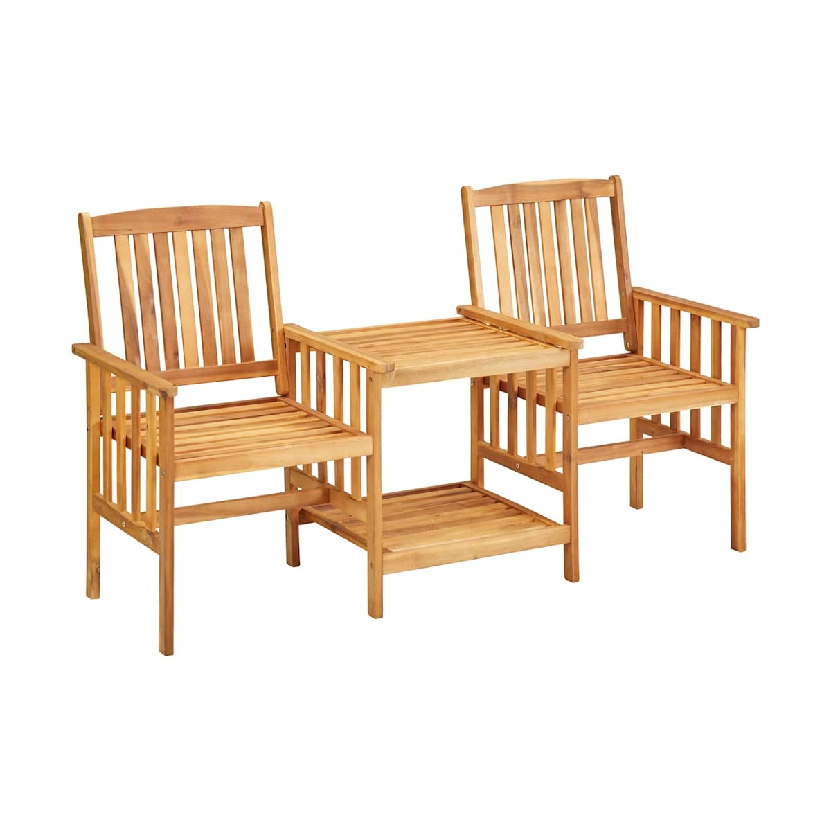 Disfrute de un maravilloso rato tomando el café con este rústico juego de bistró de madera. Será un aporte realmente fácil de usar y llamativo para tu jardín y patio. La mesa y las sillas están hechas de madera maciza de acacia con un acabado al aceite, lo que les confiere una gran estabilidad y robustez. La robusta superficie y el estante inferior son ideales para guardar tus tazas, libros y otros artículos pequeños. Y los respaldos y apoyabrazos de las sillas garantizan una experiencia de descanso relajante. Además, gracias a su acabado al aceite, el mueble es fácil de limpiar con un paño húmedo. Los cojines añaden comodidad adicional. Cada cojín cuenta con dos juegos de cuerdas para fijarlo firmemente en el bistró. Nota: Para prolongar la vida útil de los muebles de exterior, te recomendamos que los limpies con regularidad y no los dejes al aire libre sin protección innecesariamente.Limpieza: Usa una solución de jabón suaveAlmacenamiento: Si es posible, guarda el producto en un lugar fresco y seco en el interior. Si el producto se almacena al aire libre, protégelo con una funda impermeable. Limpia y seca el exceso de agua o nieve de las superficies planas después de una lluvia o nevada. Permite la ventilación para evitar daños relacionados con la humedad.