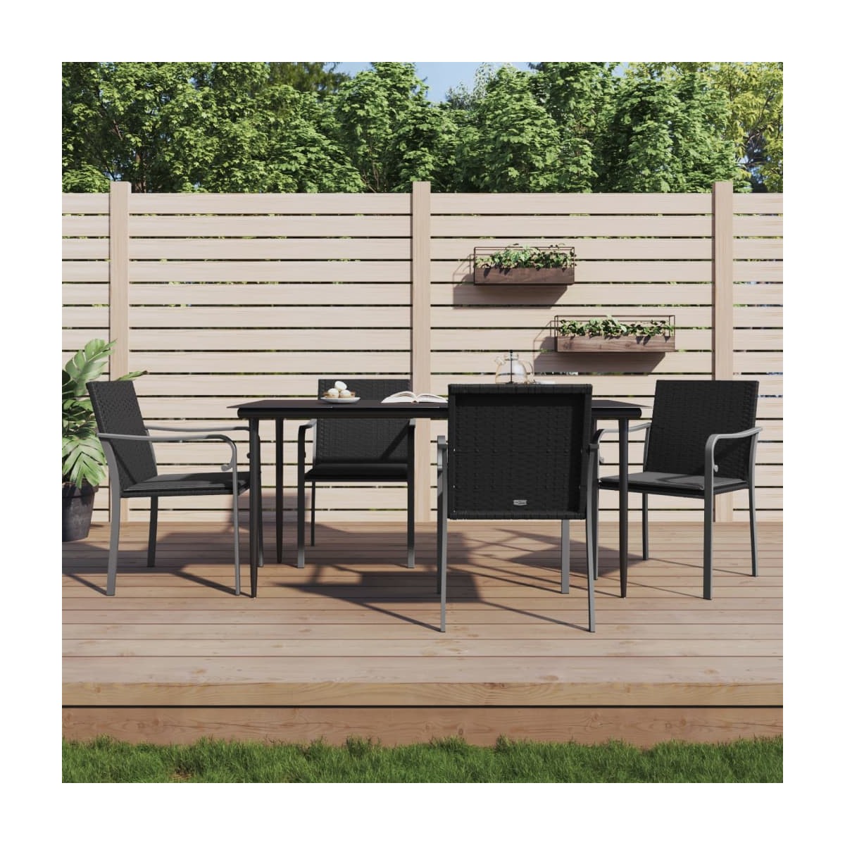Este juego de comedor para jardín, que combina estilo y funcionalidad, está destinado a ser la pieza central del jardín, el patio o cualquier otro espacio de la casa. Material resistente a la intemperie: El ratán PE, también conocido como ratán sintético, es resistente a la intemperie y fácil de limpiar. La parte exterior se mantiene hermosa durante mucho tiempo. Ofrece una gran calidad, comodidad y aspecto estético.Estructura resistente y estable: Las estructuras de acero hacen que el juego de comedor sea resistente y estable para usar a diario al aire libre.Práctica superficie: La superficie lisa de la mesa de comedor es de vidrio templado que se limpia fácilmente con un paño húmedo. Además, ofrece un excelente soporte para colocar comida, bebidas y objetos decorativos.Cómodo asiento: La silla de comedor está diseñada con reposabrazos para ofrecerte un asiento cómodo. El cojín del asiento, con un grueso acolchado, proporciona la máxima comodidad al sentarte. Nota:Para asegurarte de que tus muebles de exterior se mantengan hermosos, recomendamos protegerlos con una funda impermeable.