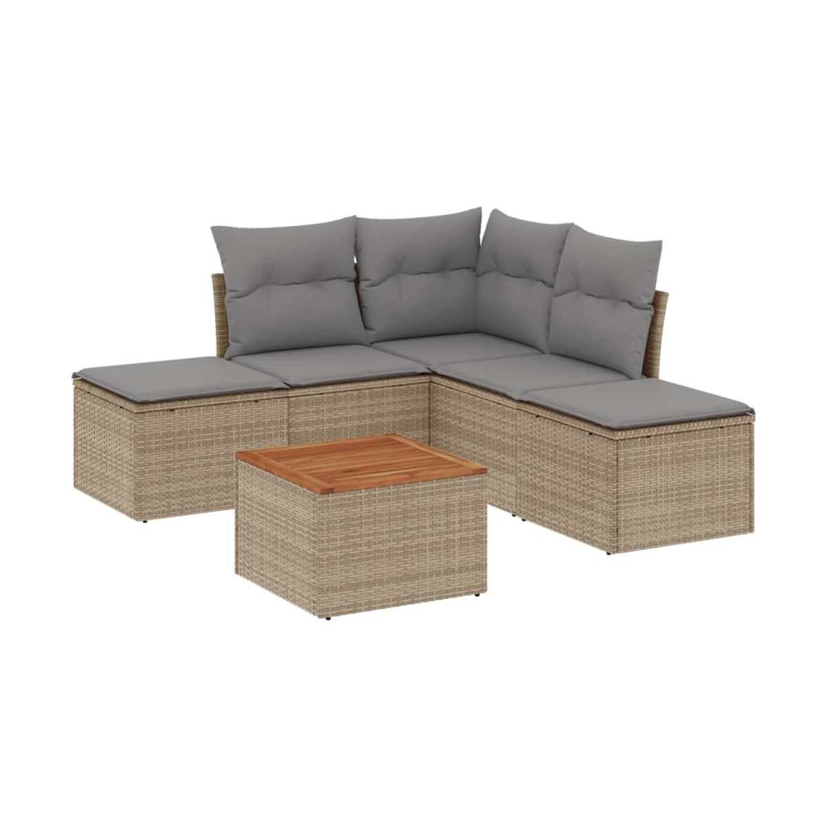 Este conjunto de sofás de jardín es el complemento perfecto para el jardín, terraza o patio, ya que proporciona un espacio confortable y acogedor para charlar con familiares y amigos o simplemente relajarte y disfrutar del aire libre. Material duradero: El ratán PE, también conocido como ratán sintético, es un material sintético resistente y de bajo mantenimiento que se parece al ratán natural. Es ligero, fácil de limpiar y se usa comúnmente para muebles de exterior debido a su durabilidad y propiedades resistentes a la intemperie.Función de almacenaje con bolsa impermeable: Cada asiento de jardín cuenta con espacio de almacenamiento debajo del asiento, completo con una bolsa resistente al agua para guardar cojines, juguetes y otros artículos. Las bolsas interiores tienen una cubierta superior y pueden fijarse firmemente a los asientos con cierres adhesivos para mayor estabilidad.Superficie estable y fácil de limpiar: Esta mesa de jardín tiene una superficie de madera de acacia que es resistente, duradero y fácil de limpiar con un paño húmedo.Reposapiés versátil: El taburete es versátil y sirve como un cómodo reposapiés para cuando descanses en el sofá o como asiento adicional en tu jardín.Diseño modular: Este conjunto de muebles de exterior tiene un diseño modular, por lo que es completamente flexible y fácil de mover, para que puedas crear una disposición de muebles de exterior personalizada. Información útil:Para asegurarte de que tus muebles de exterior se mantengan hermosos, recomendamos protegerlos con una funda impermeable.