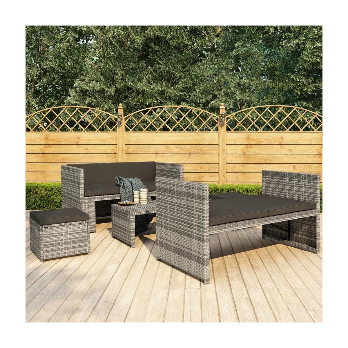 Ilumina tu aburrido espacio al aire libre con nuestro conjunto de muebles de jardín de 5 piezas. Sin duda, hará que tu jardín sea tan acogedor como tu casa. Este juego de muebles posee una estructura de acero sólido con ratán de PE para todo tipo de climas, lo que garantiza un uso fiable y duradero al aire libre. Puedes dejarte llevar hasta la relajación completa en tu tiempo de descanso gracias a los cojines y las almohadas gruesas y acolchadas. La funda de los cojines tiene cremallera para facilitar su limpieza. Además, puedes colocar tus revistas, libros, bebidas y aperitivos sobre la mesa de centro incluida con el fin de tenerlos al alcance. La entrega incluye 1 banco, 1 banco sin respaldo, 1 mesa de centro y 2 taburetes.