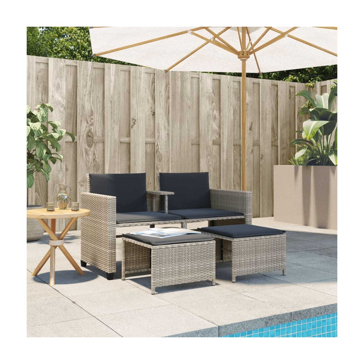¡Relájate y disfruta del aire libre en este cómodo sofá de jardín de 2 plazas! Material duradero: El ratán PE, también conocido como ratán sintético, es un material sintético resistente y de bajo mantenimiento que se parece al ratán natural. Es ligero, fácil de limpiar y se usa comúnmente para muebles de exterior debido a su durabilidad y propiedades resistentes a la intemperie. Reposapiés versátil: El taburete es versátil y sirve como un cómodo reposapiés para cuando descanses en el sofá o como asiento adicional en tu jardín. Cómoda mesa central: Este mueble de exterior cuenta con una mesa central integrada, que proporciona un lugar práctico para guardar tus objetos esenciales al alcance de la mano. Experiencia de asiento cómoda: Estos muebles de exterior, completos con cojines acolchados gruesos, ofrecen una experiencia de asiento cómoda. Funda desenfundable y lavable: Estos cojines de asiento cuentan con fundas desenfundables para facilitar el lavado y mantenimiento. Información útil:Para asegurarte de que tus muebles de exterior se mantengan hermosos, recomendamos protegerlos con una funda impermeable.