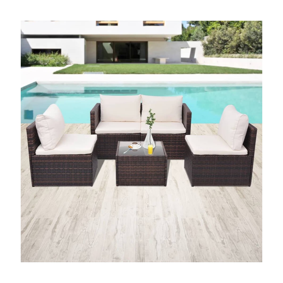 Este conjunto de sofás de ratán combina estilo y funcionalidad, y se convertirá en la principal atracción de tu jardín o patio. El conjunto de muebles completo ha sido diseñado para uso en exteriores durante todo el año. Gracias al ratán PE, que es resistente a la intemperie y al agua, el conjunto de salón es fácil de limpiar, resistente y adecuado para el uso diario. El conjunto de asientos dispone de una estructura de acero con recubrimiento de polvo robusta, que hace que sea muy duradero. También es ligero y modular, lo que hace que sea totalmente flexible y fácil de moverse para adaptarse a cualquier entorno. Los gruesos cojines desmontables son muy cómodos. Las fundas de los cojines con cremallera, se pueden quitar y lavar fácilmente. La entrega incluye 2 sofás (cada uno con un reposabrazos), 2 sofás sin reposabrazos, 1 mesa de centro, 4 cojines de asiento y 4 cojines de respaldo. Nota: Le recomendamos cubrir los muebles de jardín en condiciones de lluvia, nieve y heladas.