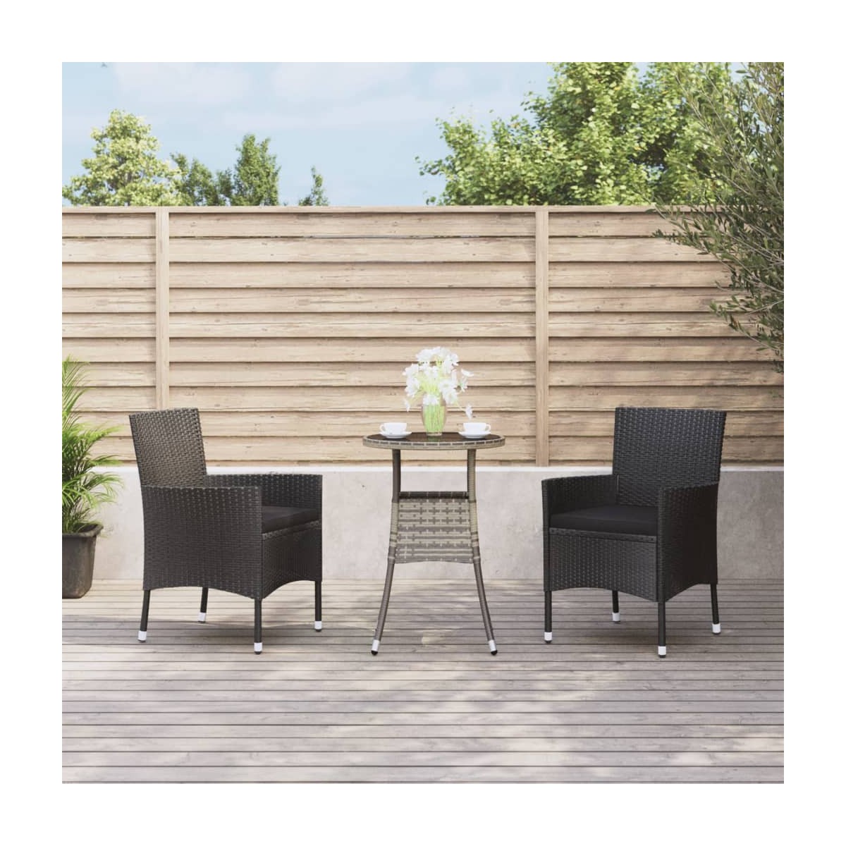 Este elegante juego de muebles para el jardín te brinda momentos agradables y cómodos con tu familia y tus amigos. Material duradero: El ratán PE, también conocido como ratán sintético, es resistente a la intemperie y fácil de limpiar. La parte exterior se mantiene hermosa durante mucho tiempo. Ofrece una gran calidad, comodidad y aspecto estético. Estructura resistente y estable: La estructura de acero con recubrimiento en polvo del conjunto de muebles de jardín garantiza su solidez y estabilidad. Asiento cómodo: Diseñadas con reposabrazos y respaldos, estas sillas de cafetería para jardín proporcionan la máxima comodidad. Los cojines acolchados de las sillas de terraza también ofrecen un plus de confort al sentarte. Superficie robusta: La robusta superficie de la mesita es perfecta para colocar comidas, bebidas, jarrones, fruteros u otros objetos decorativos. Nota:Para asegurarte de que tus muebles de exterior se mantengan hermosos, recomendamos protegerlos con una funda impermeable.
