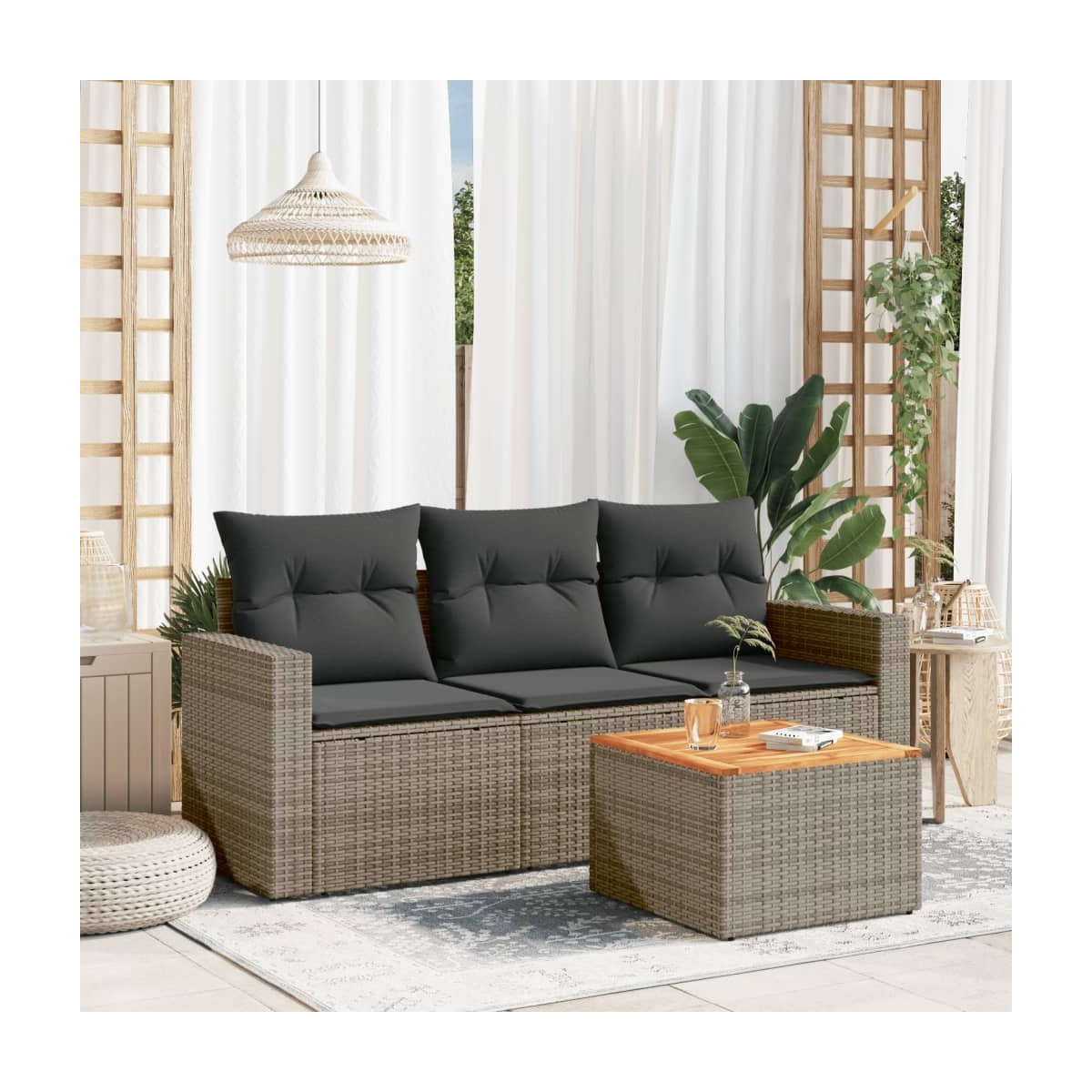 Este conjunto de sofás de jardín es el complemento perfecto para el jardín, terraza o patio, ya que proporciona un espacio confortable y acogedor para charlar con familiares y amigos o simplemente relajarte y disfrutar del aire libre. Material duradero: El ratán de PE, también conocido como ratán sintético, es un material sintético resistente y de bajo mantenimiento que se parece al ratán natural. Es ligero, fácil de limpiar y se usa comúnmente para muebles de exterior debido a su durabilidad y propiedades resistentes a la intemperie.Experiencia de asiento cómoda: Estos muebles de exterior, completos con cojines acolchados gruesos, ofrecen una experiencia de asiento cómoda.Superficie estable y fácil de limpiar: Esta mesa de jardín tiene una superficie de madera de acacia que es resistente, duradero y fácil de limpiar con un paño húmedo.Funda desenfundable y lavable: Estos cojines de asiento cuentan con fundas desenfundables para facilitar el lavado y mantenimiento.Diseño modular: Este conjunto de muebles de exterior tiene un diseño modular, por lo que es completamente flexible y fácil de mover, para que puedas crear una disposición de muebles de exterior personalizada. Información útil:Para asegurarte de que tus muebles de exterior se mantengan hermosos, recomendamos protegerlos con una funda impermeable.