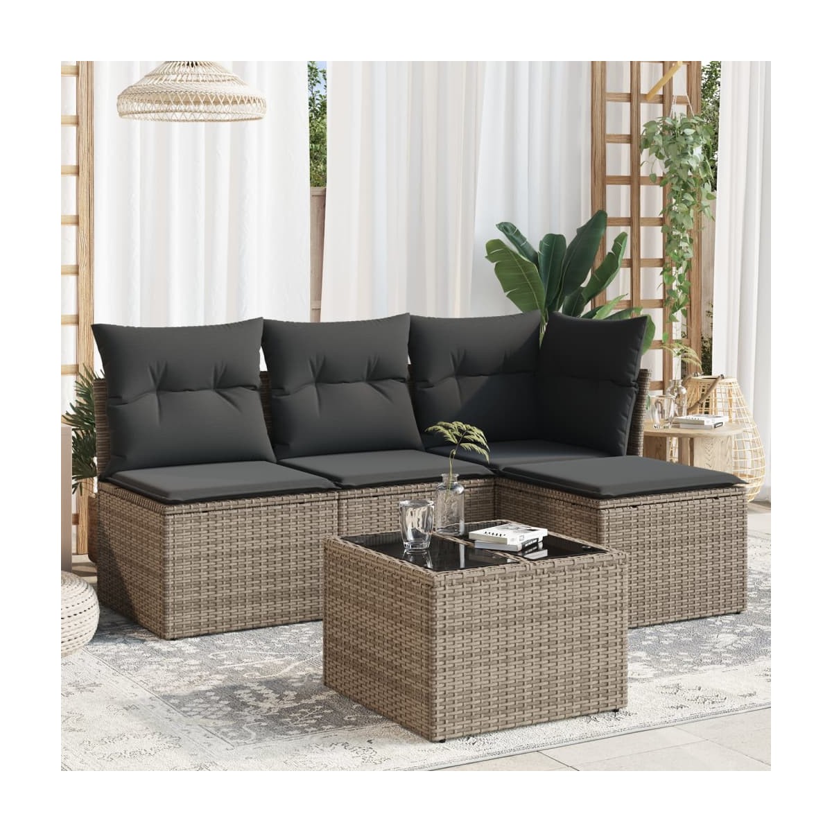 - Material: Ratán PE, acero con recubrimiento en polvo, vidrio templado
