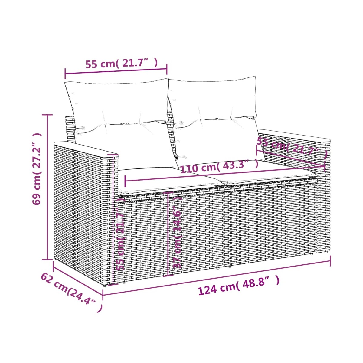 - Dimensiones del cojín de respaldo: 55 x 45 x 13 cm (largo x ancho x profundo)