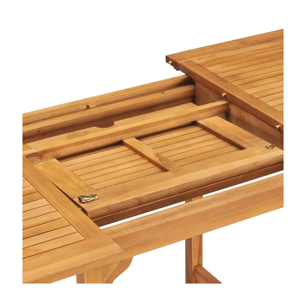 Este juego de comedor de jardín de madera es perfecto para cenar al aire libre o relajarte en el jardín o en el patio. También es ideal para uso en interiores. Hecho de madera dura de teca extremadamente duradera, este mueble de teca ha sido secado al horno y lijado finamente para darle una apariencia muy lisa. La madera de teca es conocida por su excepcional fortaleza y resistencia a la intemperie, lo que la hace mucho más adecuada para muebles de jardín que cualquier otro tipo de madera. La madera de teca es la elección perfecta si deseas comprar un mueble de jardín duradero. Además, también resisten la humedad y los insectos. El conjunto se aplica con un bonito acabado para darle a la madera un color cálido. Con su diseño especial, la mesa de comedor se puede extender como máximo 160 cm cuando se requiere espacio adicional. También tiene un orificio para sombrilla para brindar protección contra el sol. Además, las sillas se pueden plegar fácilmente cuando no se utilizan. Te brindan comodidad y gran conveniencia para pasar tiempo con tu familia y amigos. Además, este juego también es fácil de limpiar con un paño húmedo.