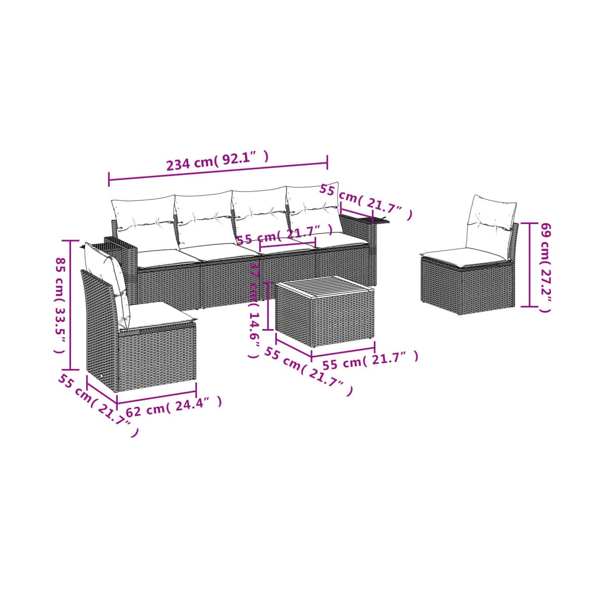 - Dimensiones del cojín de asiento: 55 x 55 x 3 cm (ancho x profundo x grosor)