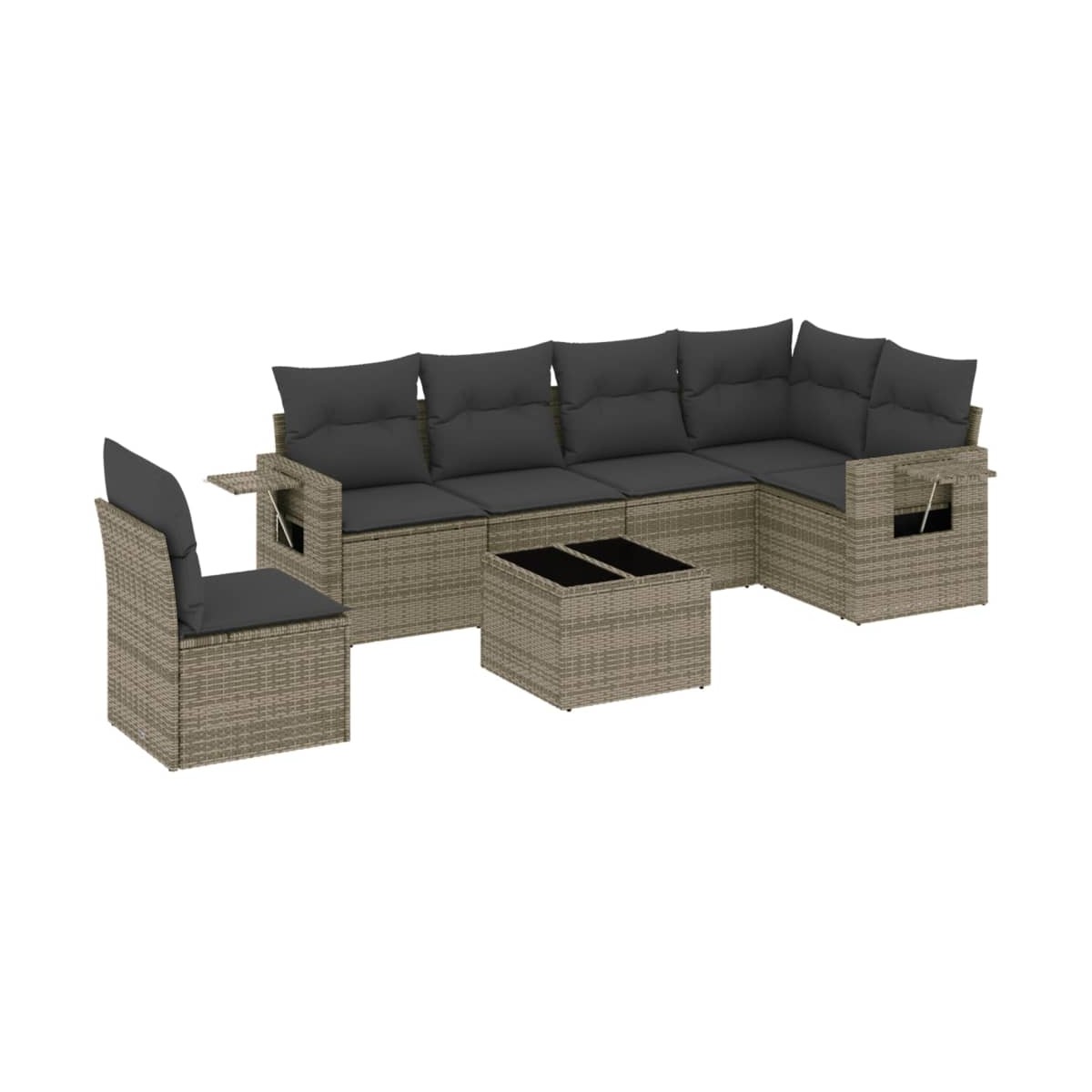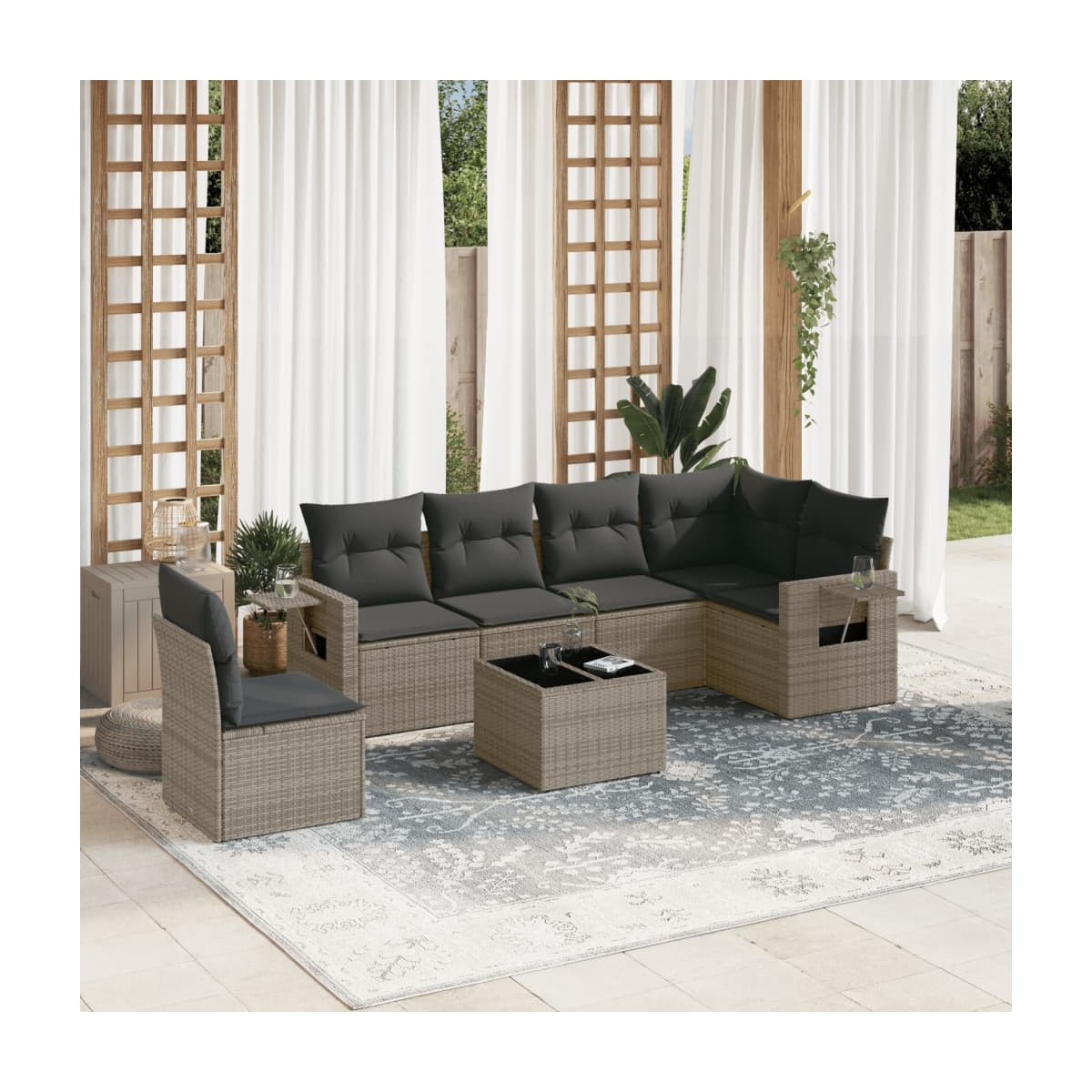 Este conjunto de sofás de jardín es el complemento perfecto para el jardín, terraza o patio, ya que proporciona un espacio confortable y acogedor para charlar con familiares y amigos o simplemente relajarte y disfrutar del aire libre. Material duradero: El ratán PE, también conocido como ratán sintético, es un material sintético resistente y de bajo mantenimiento que se parece al ratán natural. Es ligero, fácil de limpiar y se usa comúnmente para muebles de exterior debido a su durabilidad y propiedades resistentes a la intemperie.Superficie de vidrio: La superficie de la mesa de exterior es de vidrio templado resistente y duradero, por lo que es fácil de limpiar con un paño húmedo y añade un toque de elegancia a tu espacio exterior. Práctica mesa auxiliar: Este mueble de exterior cuenta con una mesa auxiliar plegable con un resorte de gas en los reposabrazos, lo que proporciona un lugar conveniente para mantener tus elementos esenciales al alcance de la mano. Experiencia de asiento cómoda: Estos muebles de exterior, completos con cojines acolchados gruesos, ofrecen una experiencia de asiento cómoda.Diseño modular: Este conjunto de muebles de exterior tiene un diseño modular, por lo que es completamente flexible y fácil de mover, para que puedas crear una disposición de muebles de exterior personalizada. Información útil:Para asegurarte de que tus muebles de exterior se mantengan hermosos, recomendamos protegerlos con una funda impermeable.
