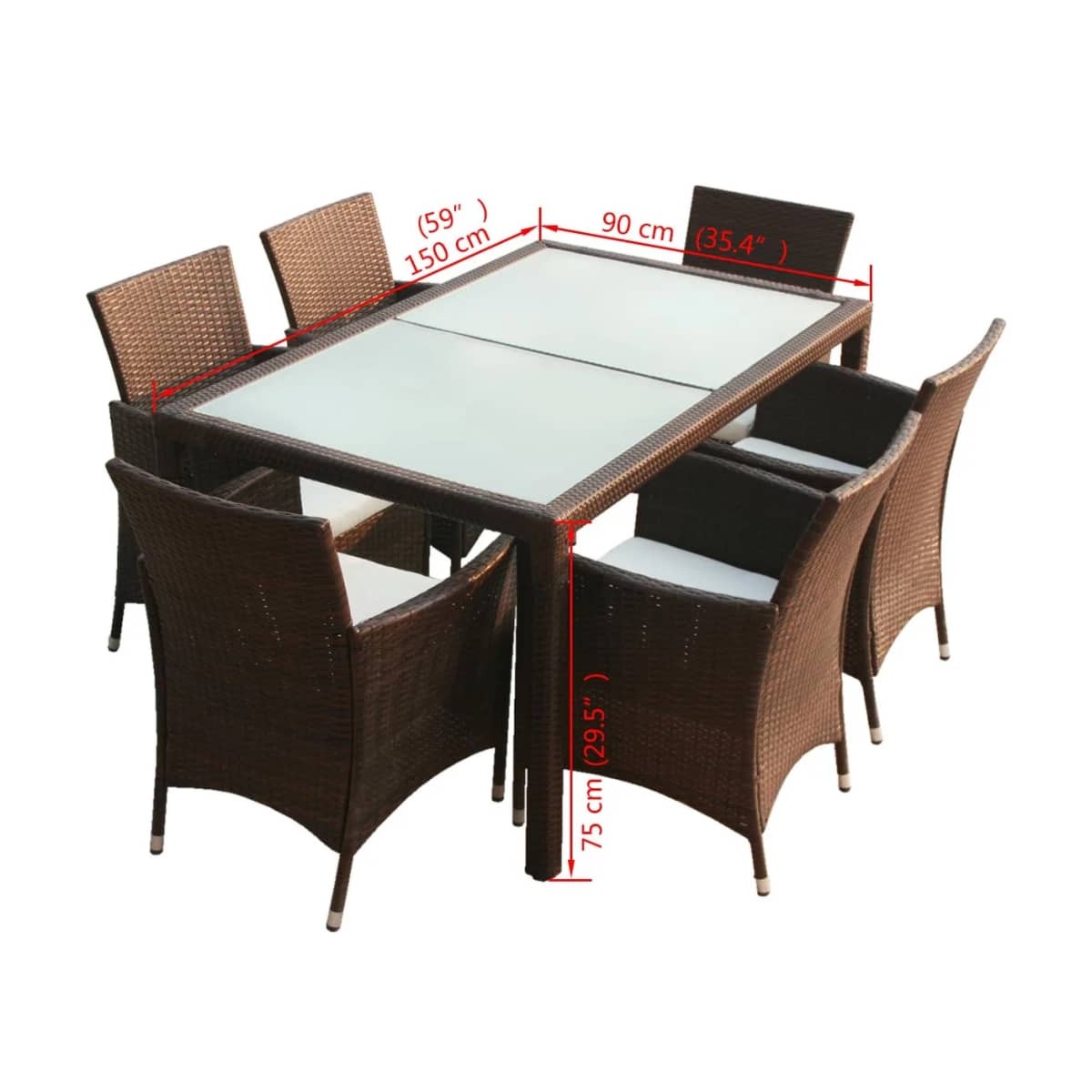 - La entrega incluye 1 mesa con encimera de vidrio, 6 sillas de ratán y 6 cojines extraíbles de asiento.