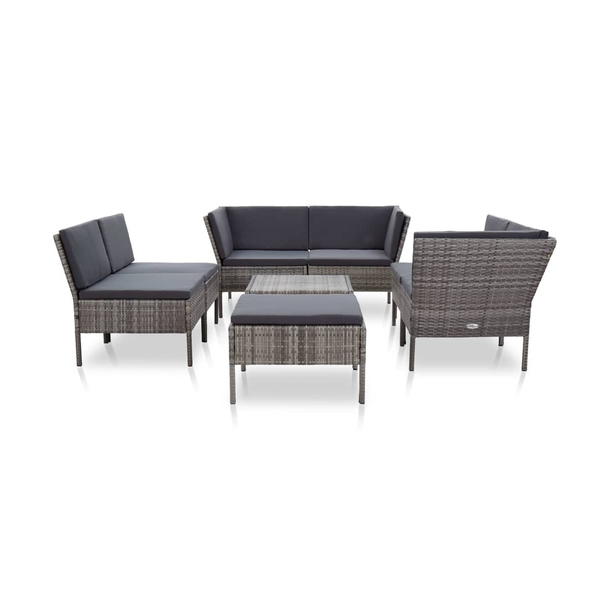 Crea la zona de estar atractiva y relajante con la que siempre has soñado con nuestro juego de sofás para jardín. ¡Puedes disfrutar de una relajante tarde soleada o de una noche veraniega con tu familia y amigos en este juego de muebles modular! El conjunto viene con 8 piezas para que puedas elegir entre diferentes diseños y combinaciones. Construido a partir de ratán PE duradero sobre una estructura de acero con recubrimiento en polvo, este conjunto es fuerte, robusto y resistente a la intemperie. Gracias al ratán sintético para todo tipo de climas, el juego de muebles es fácil de limpiar, firme y adecuado para el uso diario. Los cojines acolchados gruesos y los asientos modernos extraprofundos te harán volver a relajarte. Además, gracias a su diseño ligero y modular, podrás mover este conjunto por toda la casa con gran facilidad. La entrega incluye 3 sofás de esquina, 3 sofás centrales, 1 mesa de centro, 1 reposapiés, 9 cojines de respaldo y 7 cojines de asiento. Nota: Recomendamos cubrir el conjunto de ratán si llueve, nieva o hiela.
