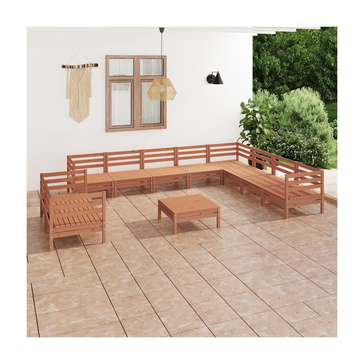 Este conjunto de salón de jardín de madera es una opción ideal para relajarse y disfrutar del buen tiempo, dormir una siesta o charlar con tu familia o amigos. Con un diseño de palets atemporal, el juego de sofás de madera añade un toque de encanto rústico a tu patio, jardín o salón. Fabricado en madera maciza de pino, este juego de muebles de exterior es muy duradero y resistente a la intemperie. Este conjunto de sofás tiene una construcción sólida y requiere poco mantenimiento. Además, el diseño modular también permite colocar el conjunto en cualquier disposición según tu gusto. Nota: Para prolongar la vida de tus muebles de exterior, te recomendamos que los protejas con una funda impermeable.