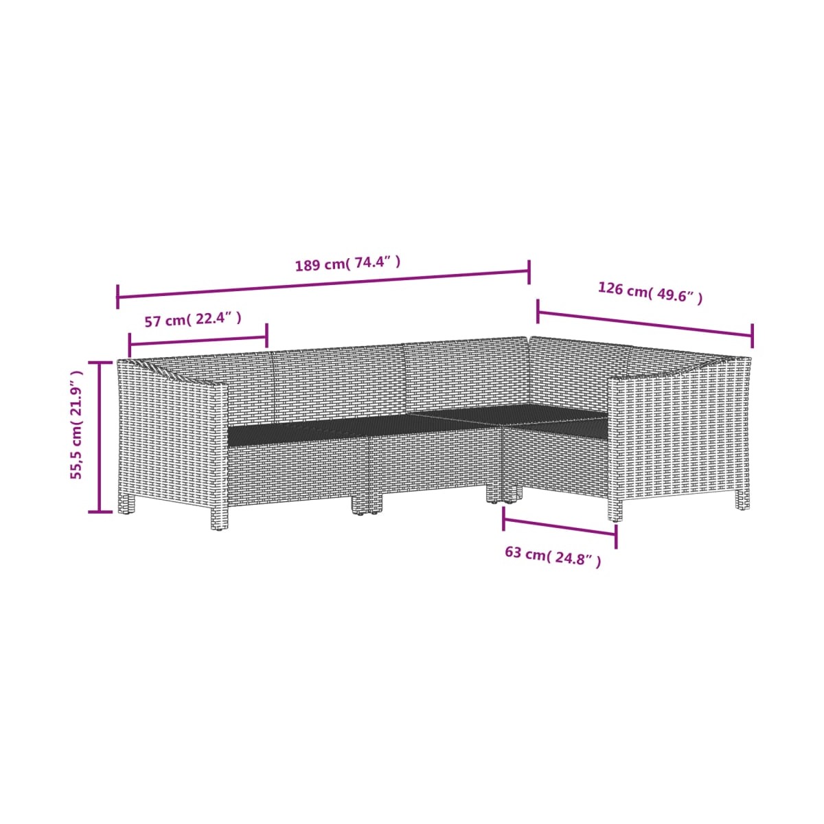 - Dimensiones del cojín de asiento del sofá/sillón: 57/60/63 x 55 x 3 cm (ancho x profundo x grosor)