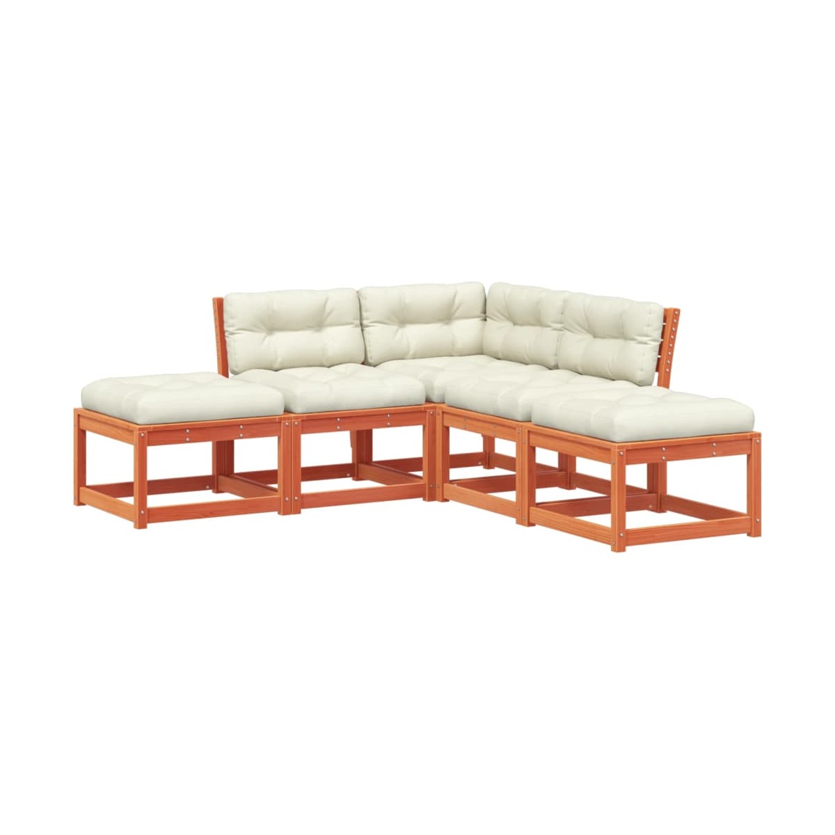 Este conjunto de sofás de jardín es el complemento perfecto para el jardín, terraza o patio, ya que proporciona un espacio confortable y acogedor para charlar con familiares y amigos o simplemente relajarte y disfrutar del aire libre. Madera de pino maciza: La madera de pino maciza es un bonito material natural. La madera de pino tiene vetas rectas, y los nudos dan al material su distintivo aspecto rústico.Asiento cómodo: Este mueble de exterior, con respaldos y cojines de acolchado grueso, ofrece una cómoda experiencia de asiento.Diseño de listones: El diseño de listones del sofá de exterior evita que el agua se acumule de forma eficaz, para que el asiento permanezca seco y no se pudra.Diseño modular: Este conjunto de muebles de exterior tiene un diseño modular, por lo que es completamente flexible y fácil de mover, para que puedas crear una disposición de muebles de exterior personalizada. Información útil:Para asegurarte de que tus muebles de exterior se mantengan hermosos, recomendamos protegerlos con una funda impermeable.