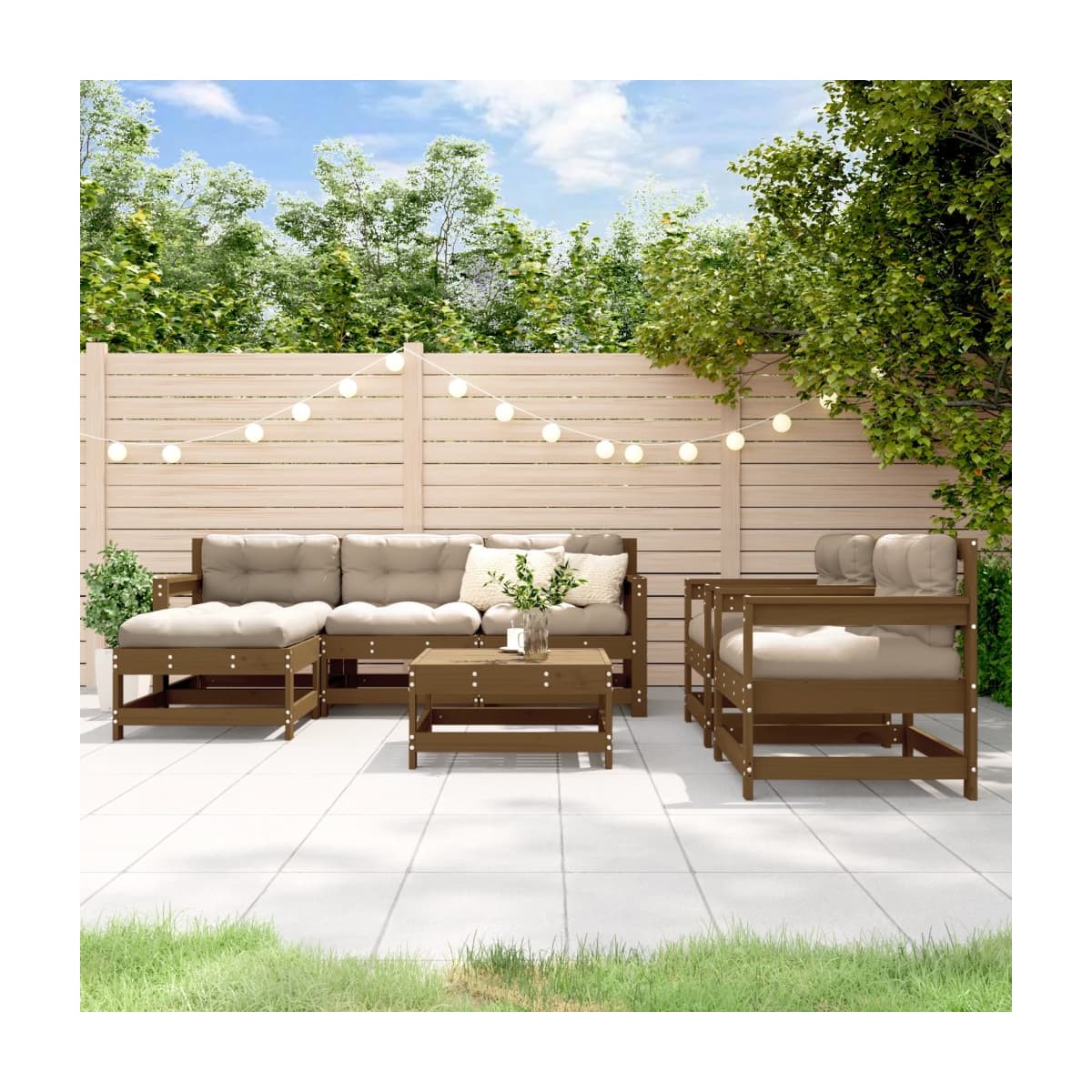 Este juego de sofás de jardín de madera, que destaca por su diseño de listones, será un gran complemento para el jardín, el patio o la terraza, para poder disfrutar de un rato agradable con la familia o los amigos. Madera de pino maciza: La madera de pino maciza es un bonito material natural. La madera de pino tiene vetas rectas, y los nudos dan al material su distintivo aspecto rústico.Estructura robusta y estable: Las estructuras de madera hacen que el conjunto de muebles sea robusto y estable para usar a diario al aire libre.Diseño modular: El juego de sofás es flexible y fácil de mover. Puedes combinarlo con otros segmentos modulares de la tienda web para crear tus propias configuraciones de juego de muebles de jardín. Información útil:Para asegurarte de que tus muebles de exterior se mantengan hermosos, recomendamos protegerlos con una funda impermeable.Los cojines no están incluidos en la entrega.