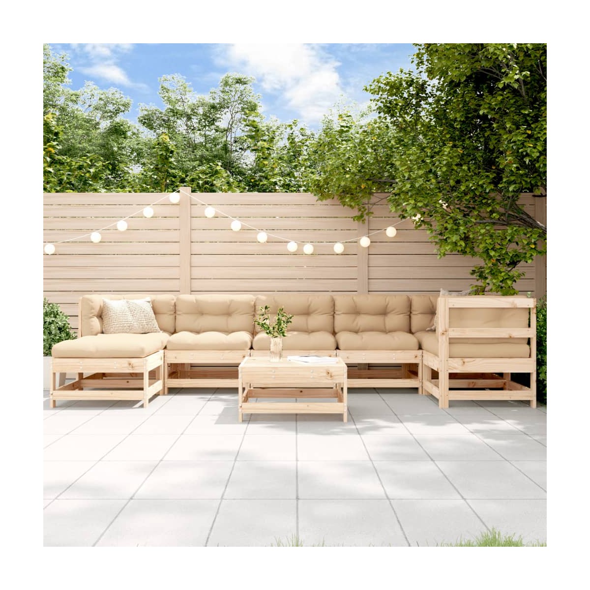Este juego de sofás de jardín de madera, que destaca por su diseño de listones, será un gran complemento para el jardín, el patio o la terraza, para poder disfrutar de un rato agradable con la familia o los amigos. Madera de pino maciza: La madera de pino maciza es un bonito material natural. La madera de pino tiene vetas rectas, y los nudos dan al material su distintivo aspecto rústico.Estructura robusta y estable: Las estructuras de madera hacen que el conjunto de muebles sea robusto y estable para usar a diario al aire libre.Diseño modular: El juego de sofás es flexible y fácil de mover. Puedes combinarlo con otros segmentos modulares de la tienda web para crear tus propias configuraciones de juego de muebles de jardín. Información útil:Para asegurarte de que tus muebles de exterior se mantengan hermosos, recomendamos protegerlos con una funda impermeable.Los cojines no están incluidos en la entrega.