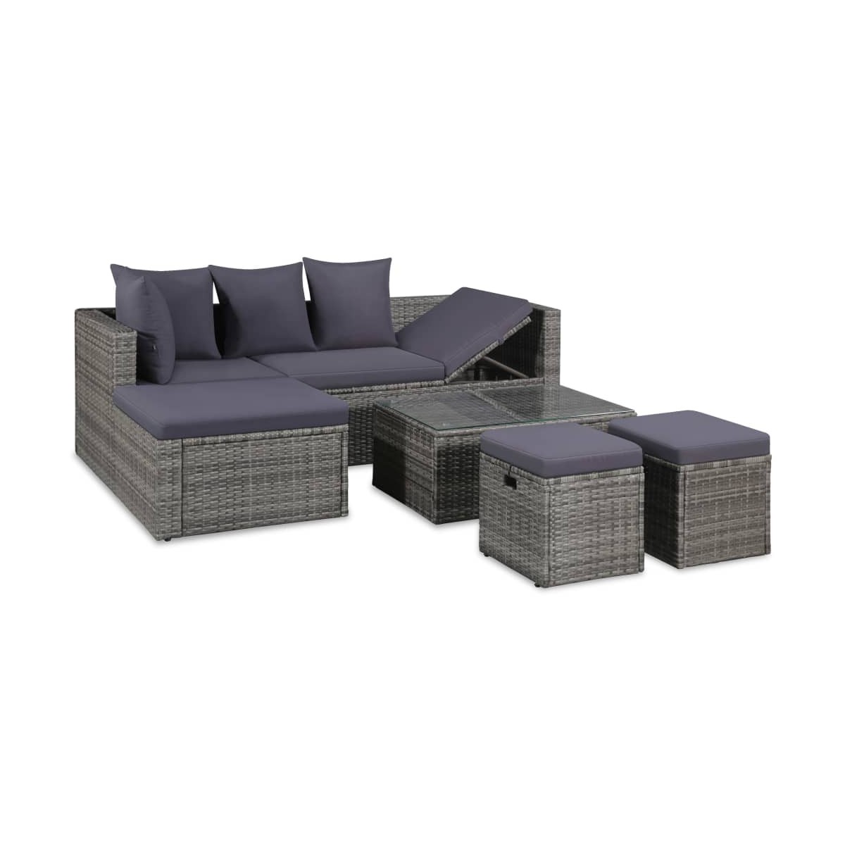 Nuestro set de muebles de jardín de poli ratán combina estilo y funcionalidad, y es una opción ideal para relajarse cerca de la piscina, en su patio o en el jardín. El conjunto de muebles de jardín cuenta con una robusta estructura con de acero con recubrimiento en polvo, por lo que es muy estable y duradero. Gracias al ratán PE resistente al agua, el juego de sofás de exterior es fácil de limpiar, resistente y adecuado para uso diario al aire libre. La superficie de vidrio también es fácil de limpiar con un paño húmedo. Las almohadas gruesas, suaves y rellenas de espuma y los cojines de asiento son muy cómodos. Las fundas de poliéster que apenas necesitan mantenimiento se pueden quitar y lavar fácilmente. Nuestro juego de sofás de jardín es fácil de montar. La entrega incluye 1 sofá de esquina, 1 mesa de café, 2 reposapiés, 4 almohadas y 6 cojines asiento. Nota: Rcomendamos cubrir el conjunto en condiciones de lluvia, nieve y heladas.