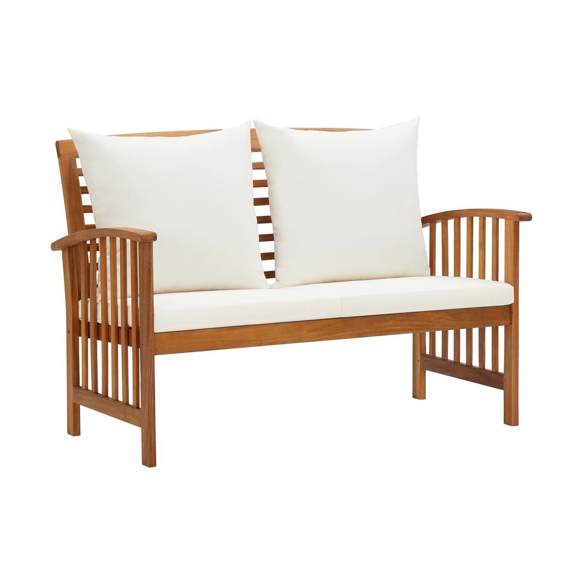 El juego de muebles de jardín de madera agrega un aspecto vintage y está especialmente diseñado para tu jardín, patio u otro espacio al aire libre. El juego de muebles de exterior está hecho con una construcción de madera maciza de acacia con un acabado de aceite, lo que lo hace estable y duradero. Los gruesos cojines del asiento y el respaldo hacen que el conjunto sea suave para sentarse. Gracias al superficie de madera maciza con diseño de listones, la mesa de centro te ofrece espacio para poner tus snacks, cestas de frutas, elementos decorativos, así como otros imprescindibles. El respaldo ligeramente curvado y los reposabrazos añaden comodidad al asiento del banco. Nota importante: Los colores y las vetas de la madera varían de una pieza a otra, por lo que cada una es única; la entrega es aleatoria.