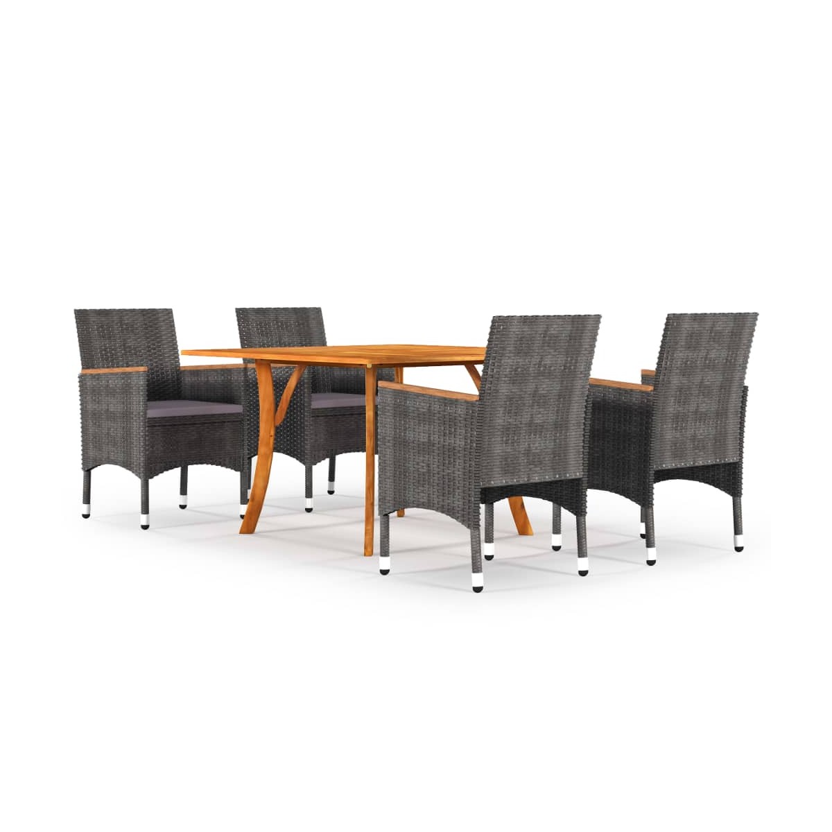 ¡Crea una estética atractiva y cohesionada en el espacio al aire libre de tu casa con este juego de comedor para jardín! Esta mesa de exterior está hecha de madera maciza de acacia, lo que la hace robusta y estable. La superficie con acabado de aceite también facilita la limpieza de la mesa con un paño húmedo. Además, las patas curvas contribuyen a su elegante diseño. Con una estructura de acero cubierto con ratán PE resistente a la intemperie, estas sillas de comedor son robustas y fáciles de limpiar. Los cojines acolchados gruesos añaden comodidad en tu tiempo de descanso. Nota: Para prolongar la vida útil de los muebles de exterior, te recomendamos que los limpies con regularidad y no los dejes al aire libre sin protección innecesariamente.Limpieza: Usar una solución de jabón suaveAlmacenamiento: Si es posible, guarda el producto en un lugar fresco y seco en el interior. Si el producto se almacena al aire libre, protégelo con una funda impermeable. Limpia y seca el exceso de agua o nieve de las superficies planas después de una lluvia o nevada. Permite la ventilación para evitar daños relacionados con la humedad.