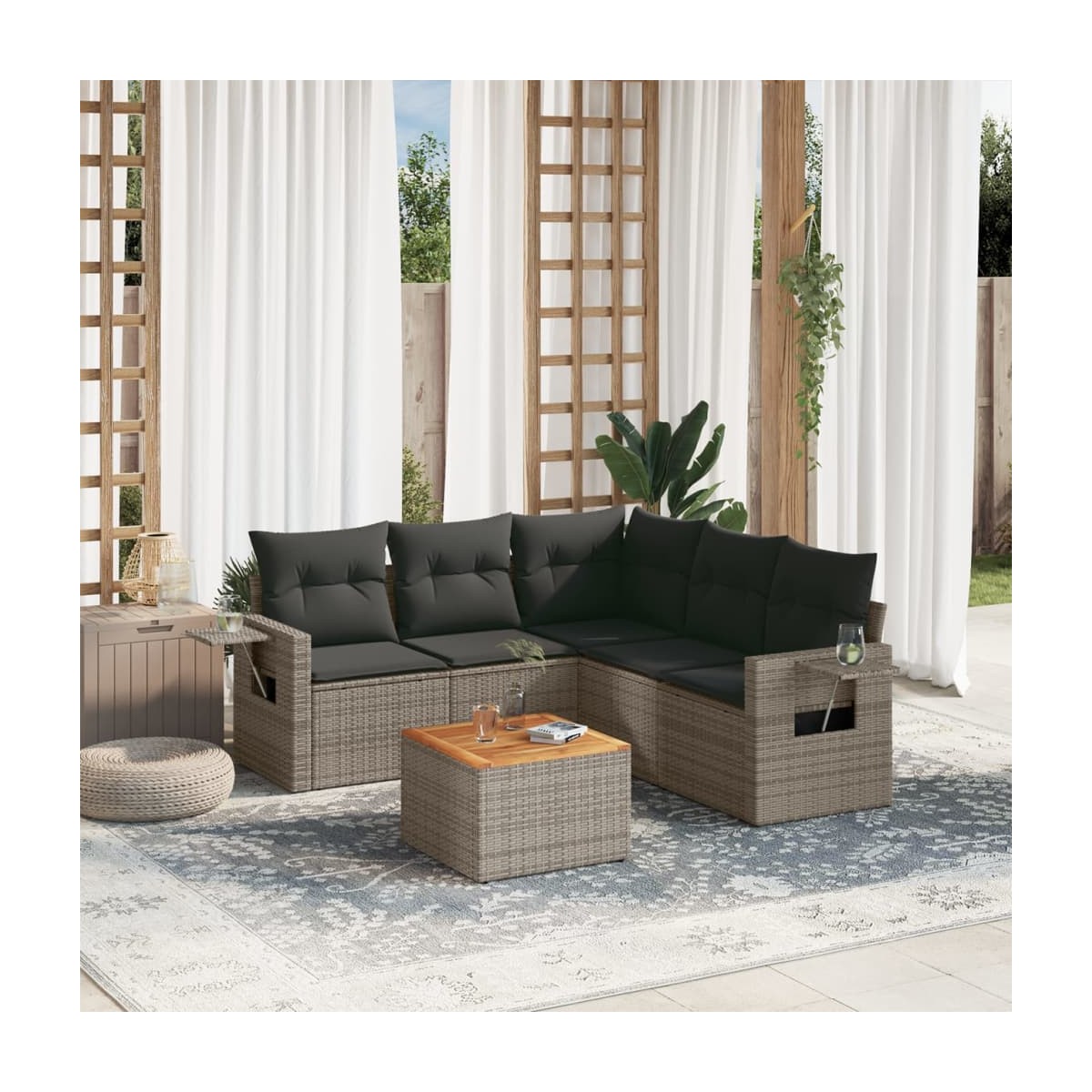 Este conjunto de sofás de jardín es el complemento perfecto para el jardín, terraza o patio, ya que proporciona un espacio confortable y acogedor para charlar con familiares y amigos o simplemente relajarte y disfrutar del aire libre. Material duradero: El ratán PE, también conocido como ratán sintético, es un material sintético resistente y de bajo mantenimiento que se parece al ratán natural. Es ligero, fácil de limpiar y se usa comúnmente para muebles de exterior debido a su durabilidad y propiedades resistentes a la intemperie.Función de almacenaje con bolsa impermeable: Cada asiento de jardín cuenta con espacio de almacenamiento debajo del asiento, completo con una bolsa resistente al agua para guardar cojines, juguetes y otros artículos. Las bolsas interiores tienen una cubierta superior y pueden fijarse firmemente a los asientos con cierres adhesivos para mayor estabilidad.Superficie estable y fácil de limpiar: Esta mesa de jardín tiene una superficie de madera de acacia que es resistente, duradero y fácil de limpiar con un paño húmedo.Práctica mesa auxiliar: Este mueble de exterior cuenta con una mesa auxiliar plegable con un resorte de gas en los reposabrazos, lo que proporciona un lugar conveniente para mantener tus elementos esenciales al alcance de la mano.Diseño modular: Este conjunto de muebles de exterior tiene un diseño modular, por lo que es completamente flexible y fácil de mover, para que puedas crear una disposición de muebles de exterior personalizada. Información útil:Para asegurarte de que tus muebles de exterior se mantengan hermosos, recomendamos protegerlos con una funda impermeable.