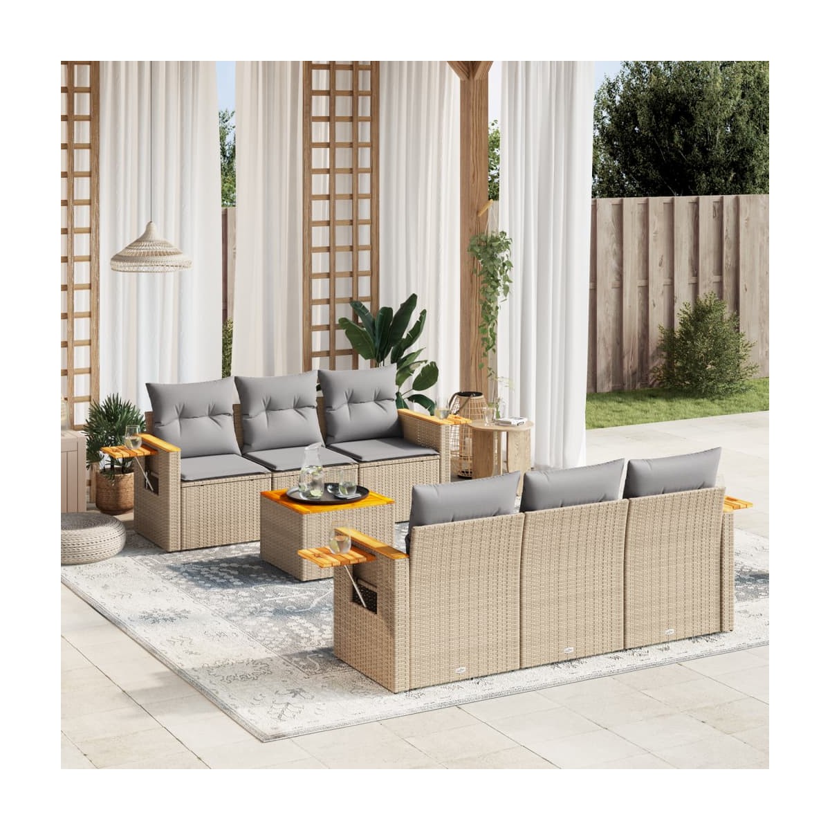 Este conjunto de sofás de jardín es el complemento perfecto para el jardín, terraza o patio, ya que proporciona un espacio confortable y acogedor para charlar con familiares y amigos o simplemente relajarte y disfrutar del aire libre. Material duradero: El ratán PE, también conocido como ratán sintético, es un material sintético resistente y de bajo mantenimiento que se parece al ratán natural. Es ligero, fácil de limpiar y se usa comúnmente para muebles de exterior debido a su durabilidad y propiedades resistentes a la intemperie.Superficie estable y fácil de limpiar: Esta mesa de jardín tiene una superficie de madera de acacia que es resistente, duradero y fácil de limpiar con un paño húmedo.Cómoda mesa auxiliar: Este mueble de exterior cuenta con una mesa auxiliar plegable con un resorte de gas en los reposabrazos, lo que proporciona un lugar conveniente para mantener tus elementos esenciales al alcance de la mano.Funda desenfundable y lavable: Estos cojines de asiento cuentan con fundas desenfundables para facilitar el lavado y mantenimiento.Diseño modular: Este conjunto de muebles de exterior tiene un diseño modular, por lo que es completamente flexible y fácil de mover, para que puedas crear una disposición de muebles de exterior personalizada. Información útil:Para asegurarte de que tus muebles de exterior se mantengan hermosos, recomendamos protegerlos con una funda impermeable.