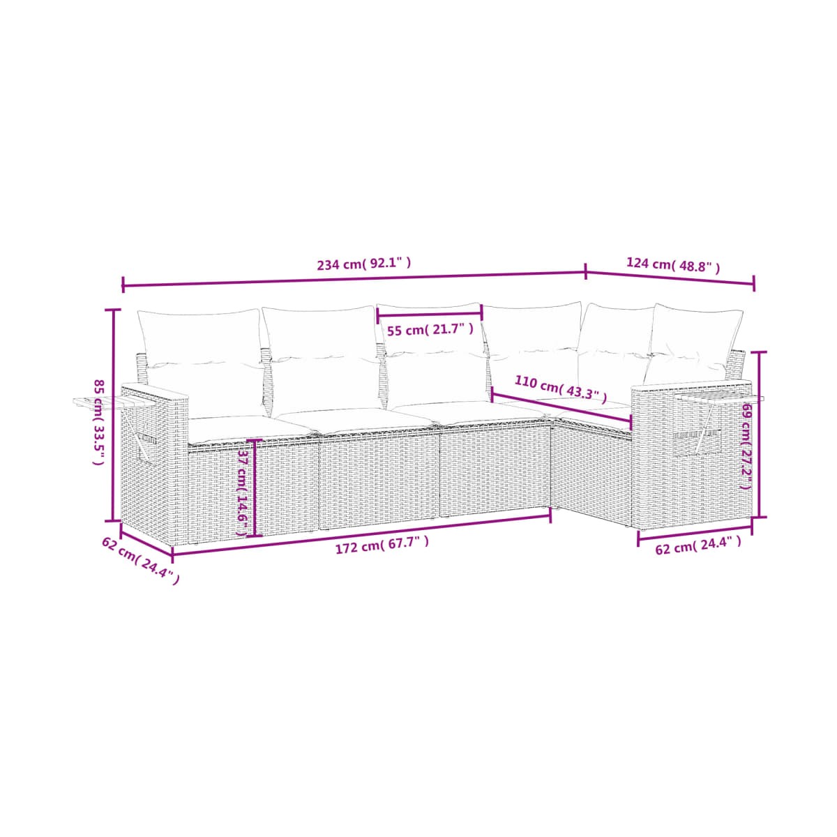- Dimensiones: 62/85 x 62 x 69 cm (ancho x profundo x alto)