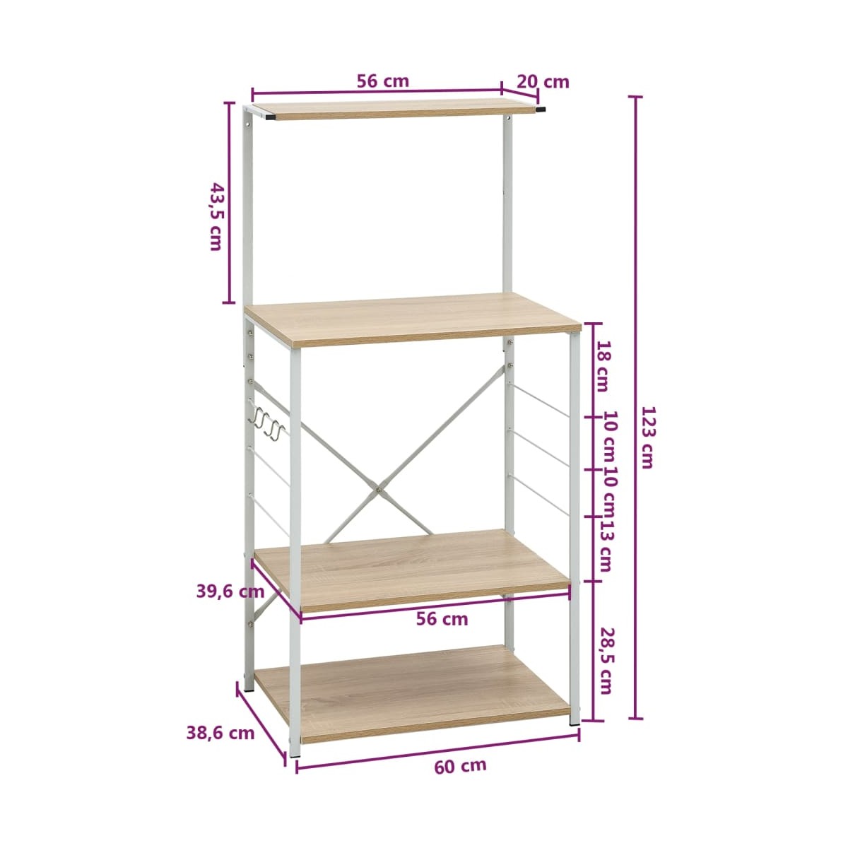 Este mueble para microondas de 4 niveles se convertirá en un complemento atemporal para la decoración de tu hogar y podrá aprovechar bien cualquier espacio. Hecho de tablero, este estante de cocina es fácil de limpiar con un paño húmedo. La fuerte estructura de acero es resistente al óxido y aumenta su robustez. Este estante tiene 4 niveles, que brindan un amplio espacio para almacenar cosas como tostadoras, especias, platos y cualquier otra cosa que desees. El armario incluye ganchos para accesorios laterales, por lo que es práctico para colgar algunas herramientas de cocina. También puedes usarlo en la sala de estar u oficina para exhibir objetos de colección, marcos de fotos, etc. El mueble es fácil de montar.
