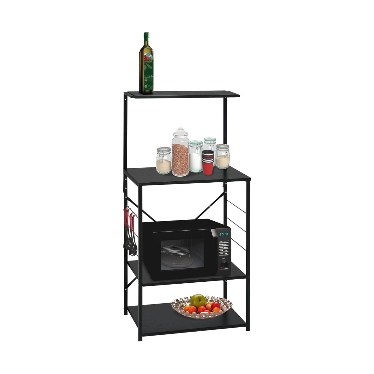 Este mueble para microondas de 4 niveles se convertirá en un complemento atemporal para la decoración de tu hogar y podrá aprovechar bien cualquier espacio. Hecho de tablero, este estante de cocina es fácil de limpiar con un paño húmedo. La fuerte estructura de acero es resistente al óxido y aumenta su robustez. Este estante tiene 4 niveles, que brindan un amplio espacio para almacenar cosas como tostadoras, especias, platos y cualquier otra cosa que desees. El armario incluye ganchos para accesorios laterales, por lo que es práctico para colgar algunas herramientas de cocina. También puedes usarlo en la sala de estar u oficina para exhibir objetos de colección, marcos de fotos, etc. El mueble es fácil de montar.