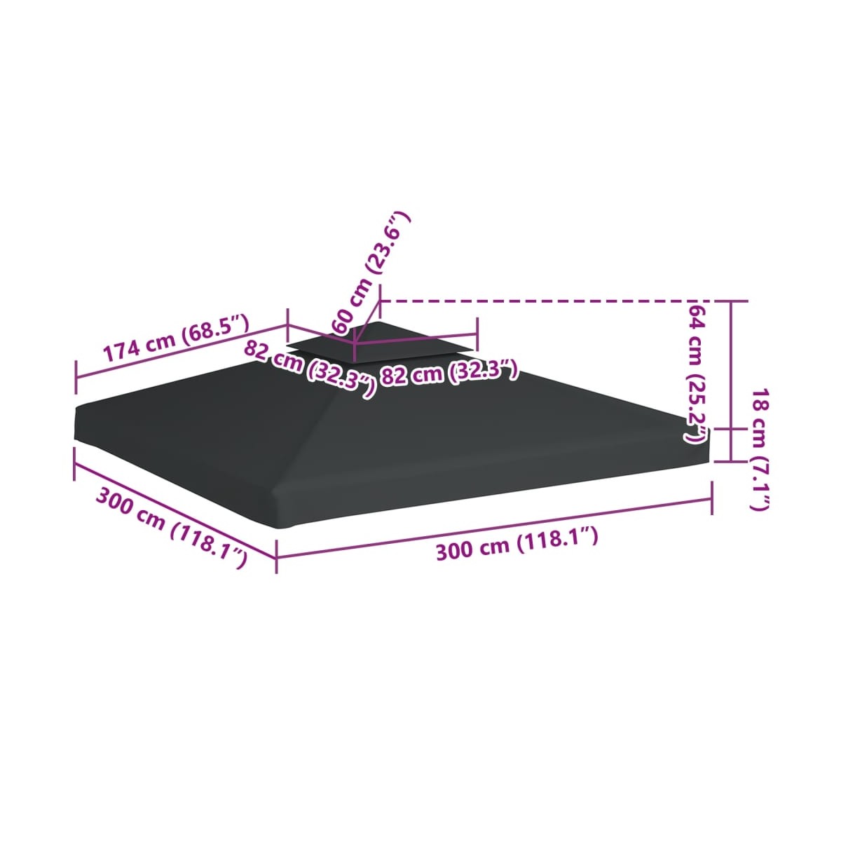 ¡Disfruta del espacio al aire libre sin quemarte a partir de ahora! ¡Esta cubierta superior de repuesto para tu cenador te brinda una nueva oportunidad para relajarte y refrescarte! Esta maravillosa cubierta para cenador cuenta con un revestimiento de PVC para protegerse contra el sol abrasador, la lluvia torrencial y otras condiciones climáticas adversas. Cada tapa tiene 8 anillos de ojales que funcionan como rebosaderos en caso de fuertes lluvias. Dado que están en el costado de la cubierta, no afectará la protección contra la lluvia cuando esté sentado debajo. La tela pesa 310 g/m², y con esquinas reforzadas para una mayor durabilidad, este refugio perfecto será una dura prueba durante todo el año para poder celebrar reuniones agradables y alegres con su familia o amigos. Ten en cuenta que esta es la cubierta superior solamente. La entrega no incluye la estructura del cenador. Esta es una cubierta superior de reemplazo de alta calidad para las personas que ya tienen una estructura.