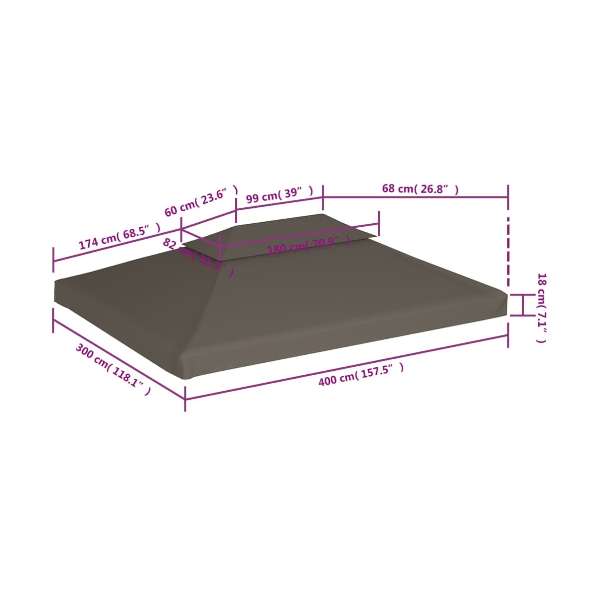 ¡Disfruta de tu espacio al aire libre con nuestro toldo de cenador de dos niveles sin importar el sol o la lluvia! Nuestro toldo de repuesto está hecho de tela de poliéster duradera con revestimiento de PVC, lo que lo hace resistente al agua . El techo del cenador protege contra el sol abrasador, las fuertes lluvias y otras condiciones climáticas adversas. Sin embargo, asegúrate de que la funda no acumule agua por tu seguridad. Este toldo tiene esquinas reforzadas para una mayor durabilidad. También ofrecemos cierres de gancho y bucle para facilitar la instalación y la unión a la estructura del cenador. Ten en cuenta que la estructura del cenador no está incluida en la entrega.