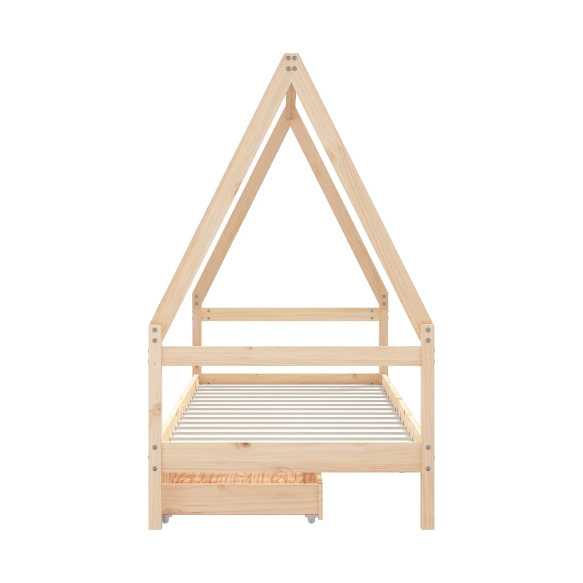 ¡Crea un espacio lleno de diversión para tu pequeño con esta fantástica cama infantil de madera! Madera maciza de pino: La estructura de la cama infantil está fabricada en madera de pino maciza. La madera de pino maciza es un bonito material natural. La madera de pino tiene vetas rectas, y los nudos dan al material su distintivo aspecto rústico.Listones resistentes: La cama para niños tiene listones de madera para un soporte firme, ventilación y estabilidad.Cama con forma de casa: Esta cama infantil está diseñada de forma inteligente, con una estructura co forma de casa, donde puedes colgar cortinas para que tu hijo tenga intimidad.Cajón de almacenaje: Los cajones de almacenaje incluidos ofrecen un amplio espacio para guardar pequeños juguetes, ropa y ropa de cama, lo que mantiene la habitación ordenada y limpia.Diseño considerado: La altura de la cama individual infantil está diseñada para estar baja hasta el suelo, lo que facilita que tu hijo entre y salga de la cama.