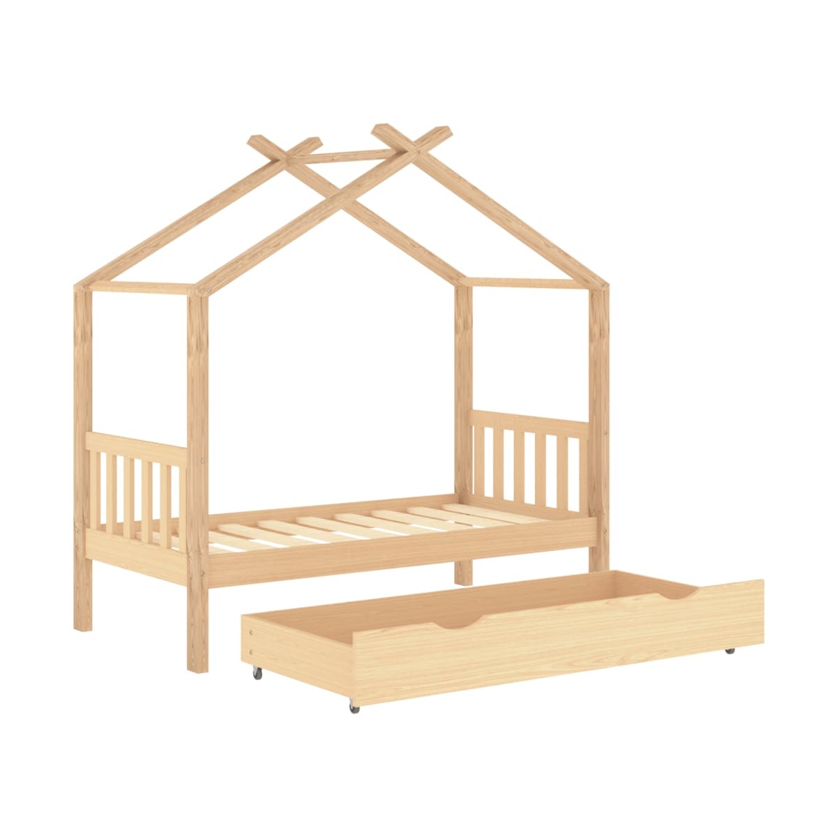 Esta estructura de cama infantil de madera con cajón es un complemento práctico y decorativo para la decoración de cualquier dormitorio. La cama tiene un diseño inteligente, con una estructura estilo casa del árbol, donde puedes colgar cortinas para crear privacidad para tu hijo. Los niños también pueden utilizarla para leer libros o como casa de juegos. Hecha de madera maciza de pino, esta estructura de cama es muy robusta y duradera. Los robustos listones ofrecen el apoyo necesario y también son muy cómodos. El cajón de la cama con 2 tiradores proporciona un amplio espacio para guardar ropa doblada, juguetes, etc., y para mantener así la habitación limpia y ordenada. Las ruedas que se deslizan fácilmente funcionan tanto sobre suelos de madera como enmoquetados. Esta estructura de cama es adecuada para un colchón de 80 x 160 cm. Ten en cuenta que la entrega incluye solo la estructura de cama; el colchón y las cortinas no están incluidos. La cama es fácil de montar. Puedes echar un vistazo a nuestra tienda para buscar el correspondiente colchón.