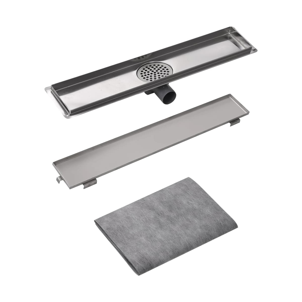 Este completo conjunto consta de 12 canales de drenaje con rejillas de plástico, 1 sistema de filtro, 1 conector de salida inferior y 2 tapas de cierre.