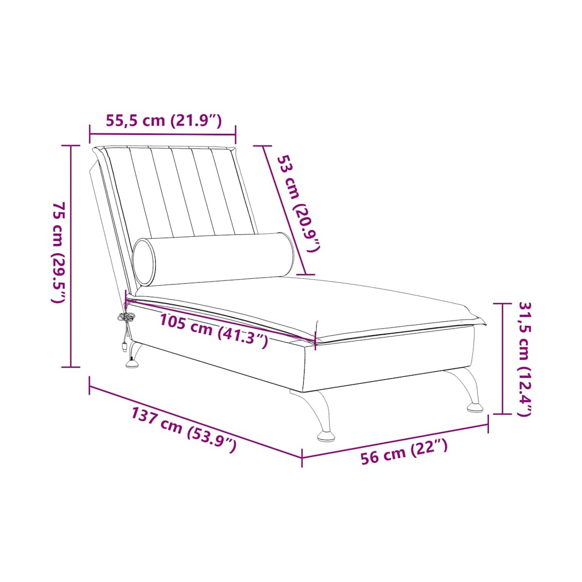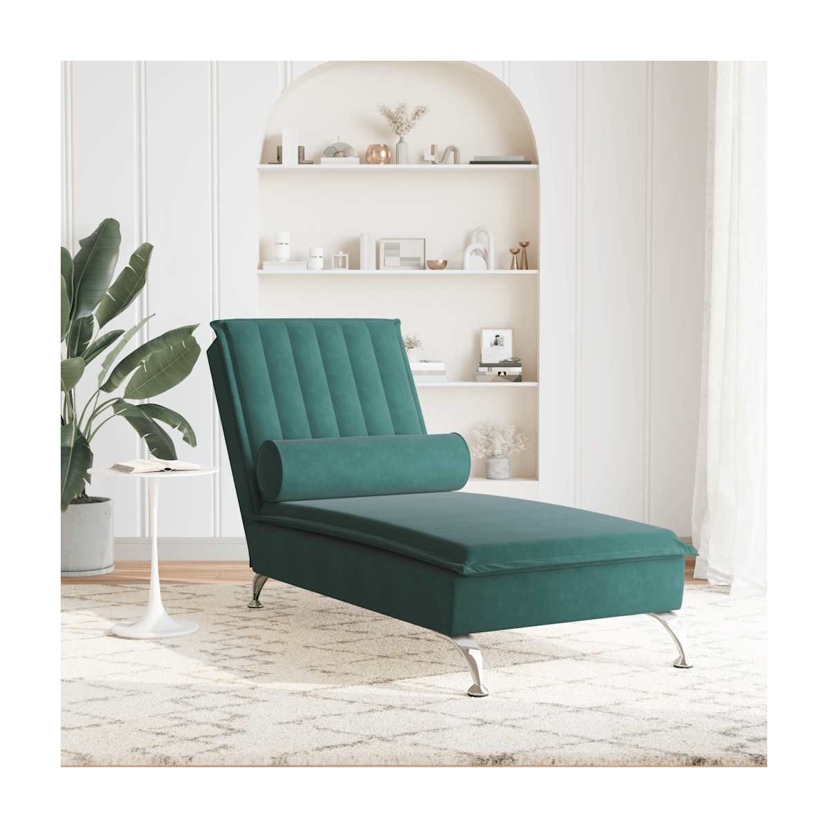 Este diván de masaje es un complemento decorativo para tu hogar y da un toque acogedor. Terciopelo suave: El terciopelo es una tela suave y cálida, agradable al tacto.Función de masaje: La almohadilla con 1 punto de masaje te permite disfrutar de un masaje mejor dirigido. Además, incluye un cable USB certificado (160 cm de longitud).Listones robustos: Los listones de madera contrachapada proporcionan una buena distribución del peso, lo que garantiza que la tumbona se mantenga en tu sitio con cada giro y vuelta del cuerpo mientras estás tumbado.Patas de metal: Estas patas de acero cromado del sofá diván garantizan robustez y estabilidad.Aspecto elegante: Refinado con líneas elegantes y una estructura precisa, este chaise longue es un aporte acogedor y moderno para tu jardín. Información útil:Para facilitar al máximo el montaje, cada producto se entrega con un manual.La longitud total es menor que la de un sofá normal, por lo que los adultos no pueden relajarse completamente en él. Información útil:Al abrir la caja, es posible que notes arrugas en la cubierta de tela. Para alisarlas, utiliza suavemente una plancha de vapor sobre la tela antes o después del montaje para lograr un acabado impecable.