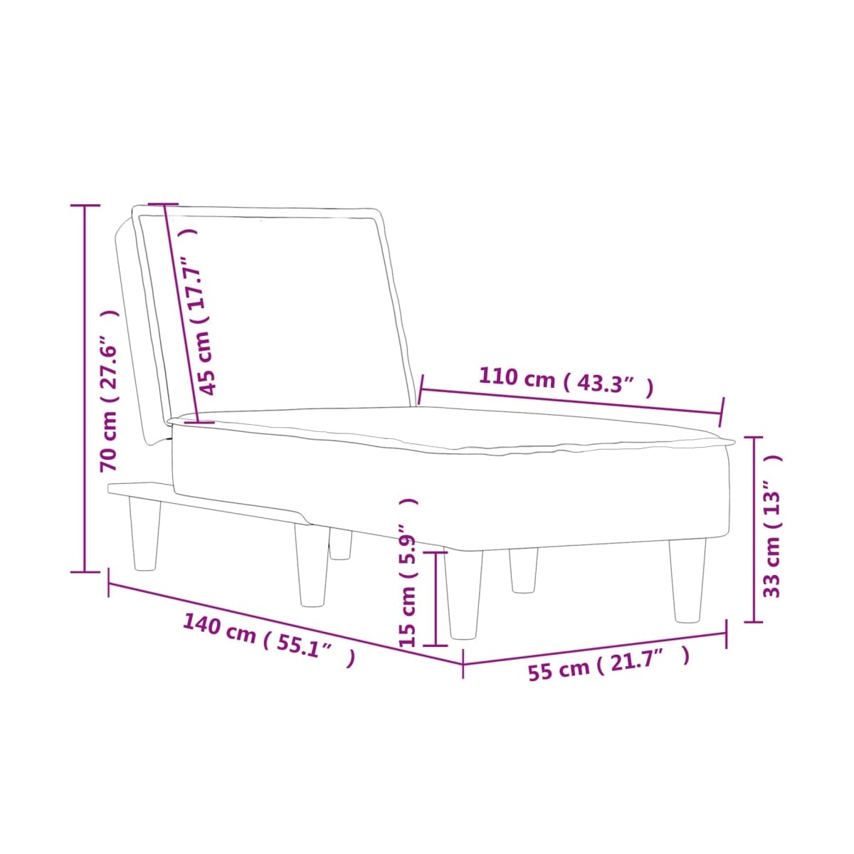 - Dimensiones totales (no reclinado): 55 x 140 x 70 cm (ancho x profundo x alto)