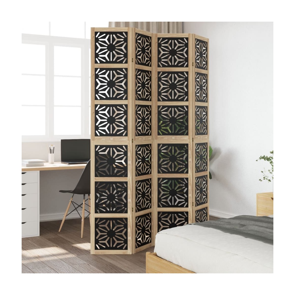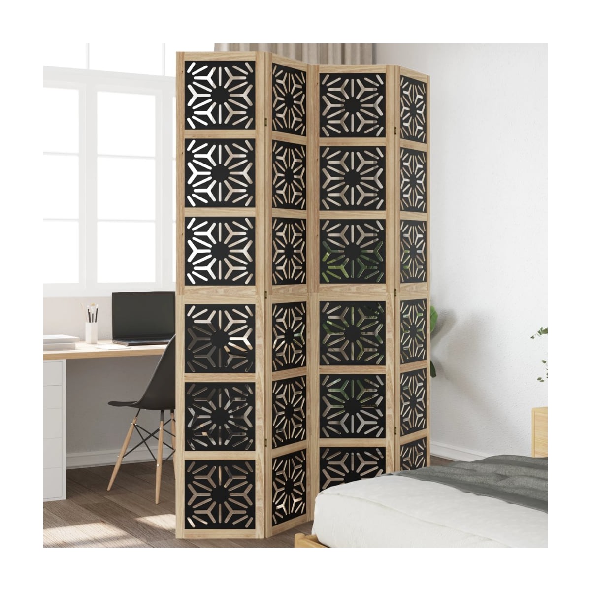 Aporta elegancia y un toque decorativo llamativo a tu espacio con este encantador biombo separador de ambientes. Duradero y fácil de limpiar: La pantalla de privacidad está hecha de madera de ingeniería, lo que la hace fácil de limpiar y duradera.Estructura estable: La estructura de madera maciza de paulownia garantiza robustez y estabilidad. La madera maciza de paulownia es un bonito material natural. La madera paulownia es altamente resistente a daños y rasguños.Flexible y fácil de plegar: Cada tabique está conectado por 3 bisagras metálicas y los paneles superior e inferior están conectados por bisagras ocultas 2 en 1. Por lo tanto, el panel divisor de ambientes se puede plegar fácilmente hasta cierto punto según sus necesidades para ahorrar espacio.Multiusos: La partición de la habitación es ideal para crear un espacio privado en su dormitorio, sala de estar, oficina y otros interiores. También puedes colocarlo frente a una ventana para bloquear la luz solar intensa.Look atractivo: Con un diseño geométrico recortado, este biombo separador de ambientes plegable añade carácter y decoración al espacio. Advertencia:Solo para uso en interiores.