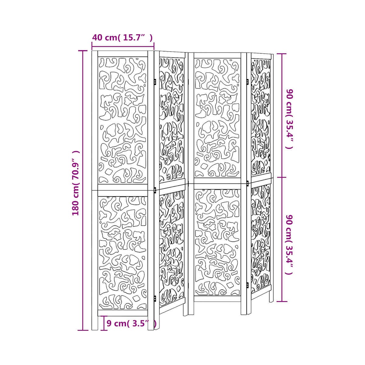 Aporta elegancia y un toque decorativo llamativo a tu espacio con este encantador biombo separador de ambientes. Duradero y fácil de limpiar: La pantalla de privacidad está hecha de madera de ingeniería, lo que la hace fácil de limpiar y duradera.Estructura estable: La estructura de madera maciza de paulownia garantiza robustez y estabilidad. La madera maciza de paulownia es un bonito material natural. La madera paulownia es altamente resistente a daños y rasguños.Flexible y fácil de plegar: Cada tabique está conectado por 3 bisagras metálicas y los paneles superior e inferior están conectados por bisagras ocultas 2 en 1. Por lo tanto, el panel divisor de ambientes se puede plegar fácilmente hasta cierto punto según sus necesidades para ahorrar espacio.Multiusos: La partición de la habitación es ideal para crear un espacio privado en su dormitorio, sala de estar, oficina y otros interiores. También puedes colocarlo frente a una ventana para bloquear la luz solar intensa.Look atractivo: Con un delicado aspecto calado, este separador de ambientes plegable añade carácter y decoración al espacio. Advertencia:Solo para uso en interiores.