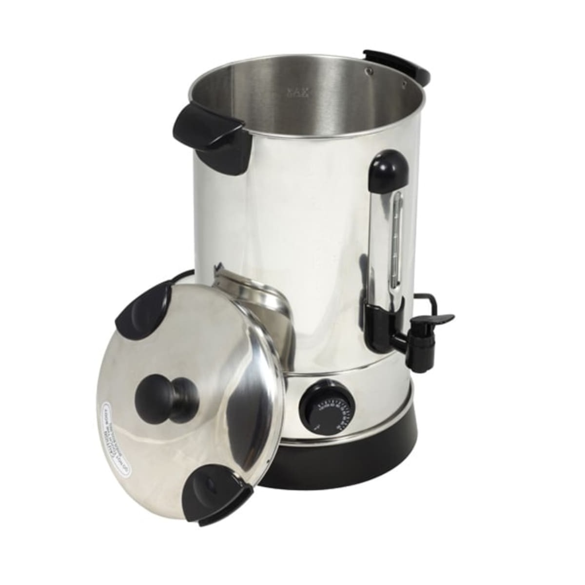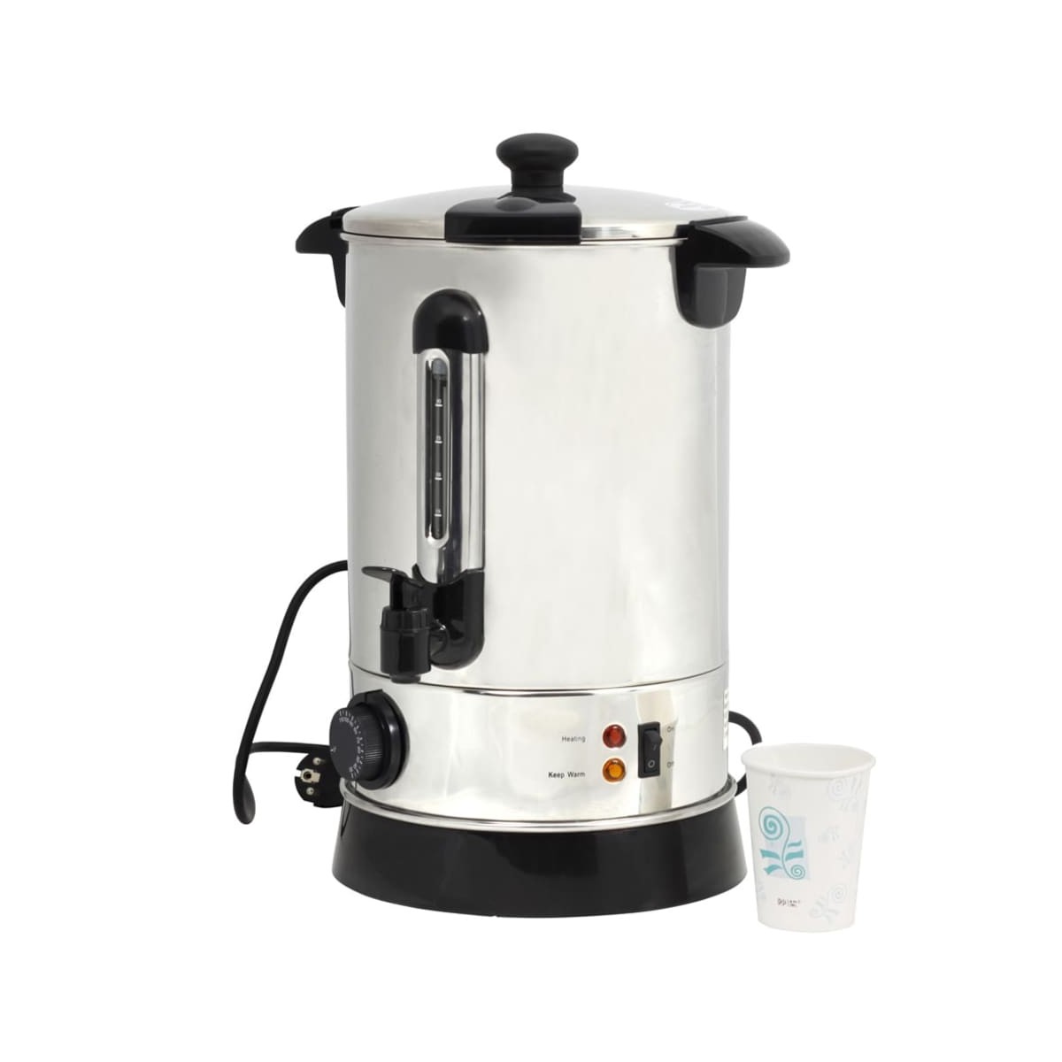 Un fabricante de vino caliente de acero inoxidable para los días fríos del año.Nada es mejor que una cálida sensación en el vientre durante la estación fría como un vino caliente, ponche o té.Tiene una capacidad de 6,8 l. Cuenta con una protección contra sobrecalentamiento. Control de temperatura de 30 ° a 100 ° C.Luces de monitoreo (calefacción y mantener caliente).La tapa se puede bloquear.Tiene un grifo grifo.Cuenta con piezas de plástico negro, la parte de base en gris.Información adicional se puede encontrar: http://en.wikipedia.org/wiki/Mulled_wine