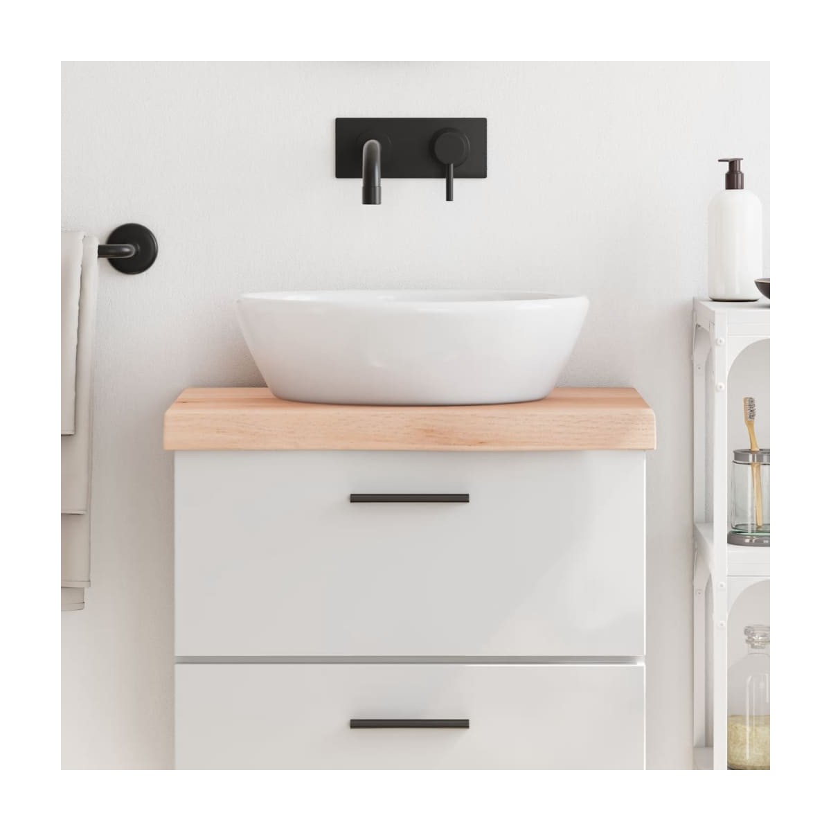 ¿Estás pensando en renovar las encimeras de la casa? ¡Esta encimera de baño de madera es una elección perfecta! Construcción duradera: Esta encimera de baño está hecha de madera maciza de roble, un bonito material natural. La madera de roble tiene un color marrón medio y unas vetas densas, que refuerzan su aspecto único.Aplicaciones versátiles: Además de una encimera de tocador de baño, esta encimera de madera se puede combinar con diferentes bases según tus necesidades. Puede utilizarse como estantería, encimera de armario, encimera de escritorio, tablero de mesa, etc.Superficie sin tratar: Como la encimera de baño está hecha de madera maciza de roble sin acabado, puedes mantener el color natural, pero también puedes pintarlo o lacarlo dependiendo de lo que prefieras.Hecho a mano con borde natural: Esta encimera de baño está hecha a mano con un borde natural. Debido a que los nudos, grietas, formas ligeramente curvadas y tonos de color son parte de la madera de roble, cada pieza de encimera de roble tiene su propio carácter único. La entrega es aleatoria. Información útil:Al ser un producto natural, la madera puede presentar nudos e imperfecciones que rellenamos con rellenos para garantizar un aspecto liso.