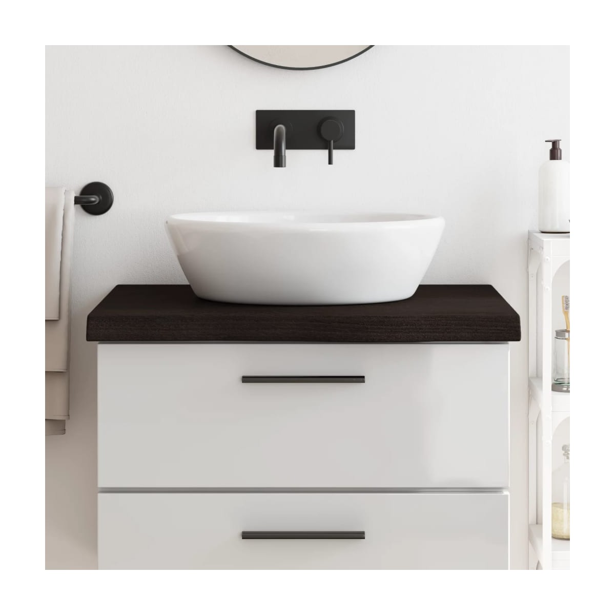 ¿Estás pensando en renovar las encimeras de la casa? ¡Esta encimera de baño de madera es una elección perfecta! Construcción duradera: Esta encimera de baño está hecha de madera maciza de roble, un bonito material natural. La madera de roble tiene un color marrón medio y unas vetas densas, que refuerzan su aspecto único.Aplicaciones versátiles: Además de una encimera de tocador de baño, esta encimera de madera se puede combinar con diferentes bases según tus necesidades. Puede utilizarse como estantería, encimera de armario, encimera de escritorio, tablero de mesa, etc.Superficie tratada: La encimera del baño se ha tratado con pintura oscura, por lo que está listo para usar, ya que no necesita un acabado adicional.Hecho a mano con borde natural: Esta encimera de baño está hecha a mano con un borde natural. Debido a que los nudos, grietas, formas ligeramente curvadas y tonos de color son parte de la madera de roble, cada pieza de encimera de roble tiene su propio carácter único. La entrega es aleatoria. Información útil:Al ser un producto natural, la madera puede presentar nudos e imperfecciones que rellenamos con rellenos para garantizar un aspecto liso.