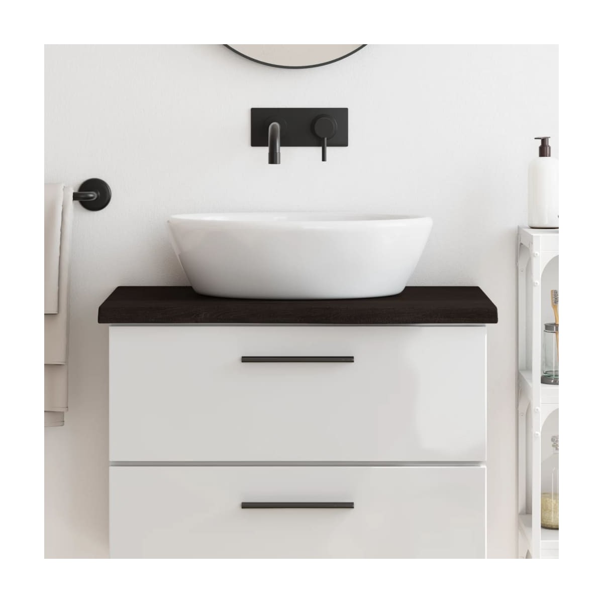 ¿Estás pensando en renovar las encimeras de la casa? ¡Esta encimera de baño de madera es una elección perfecta! Construcción duradera: Esta encimera de baño está hecha de madera maciza de roble, un bonito material natural. La madera de roble tiene un color marrón medio y unas vetas densas, que refuerzan su aspecto único.Aplicaciones versátiles: Además de una encimera de tocador de baño, esta encimera de madera se puede combinar con diferentes bases según tus necesidades. Puede utilizarse como estantería, encimera de armario, encimera de escritorio, tablero de mesa, etc.Superficie tratada: La encimera del baño se ha tratado con pintura oscura, por lo que está listo para usar, ya que no necesita un acabado adicional.Hecho a mano con borde natural: Esta encimera de baño está hecha a mano con un borde natural. Debido a que los nudos, grietas, formas ligeramente curvadas y tonos de color son parte de la madera de roble, cada pieza de encimera de roble tiene su propio carácter único. La entrega es aleatoria. Información útil:Al ser un producto natural, la madera puede presentar nudos e imperfecciones que rellenamos con rellenos para garantizar un aspecto liso.