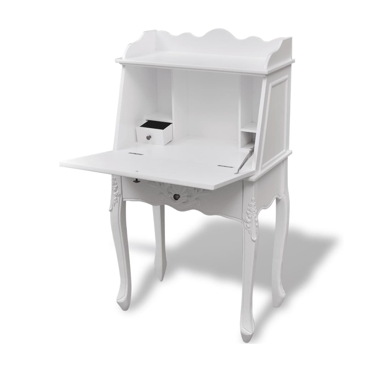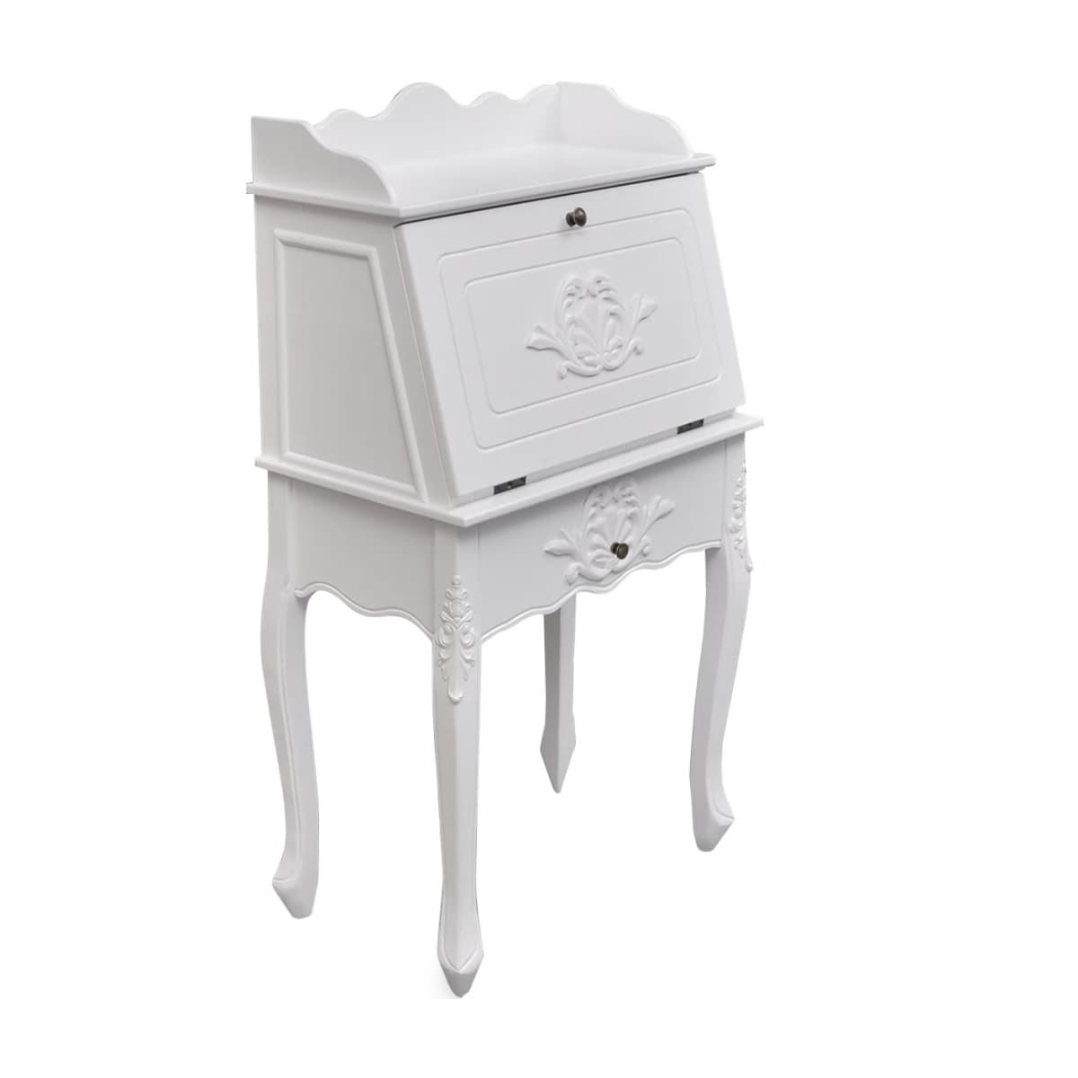Este escritorio de estilo francés en un elegante aspecto antiguo, agregará un toque sofisticado a su estudio u oficina. Este escritorio tiene una mesa para el ordenador con bisagras que también funciona como la puerta del mueble. Con un pequeño cajón y estantes, este escritorio tiene un amplio espacio de almacenamiento para bolígrafos y lápices, artículos de papelería y adornos. Fabricado con MDF de muy buena calidad y madera de pino con un acabado de pintura blanca, este mueble es muy resistente.