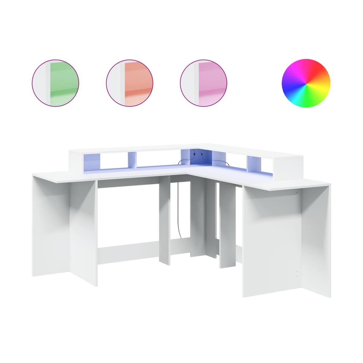 Con un amplio espacio de almacenamiento, una construcción duradera y opciones de iluminación LED, este escritorio es perfecto para crear un espacio de trabajo o de juego organizado y elegante. Material estable y duradero: La madera de ingeniería es un material duradero y estable con una superficie lisa que es resistente a la humedad, la deformación y la rotura, lo que la convierte en una opción fiable para varios proyectos.Luces LED RGB para un ambiente agradable: Este escritorio cuenta con luces LED que se pueden ajustar fácilmente para crear un espectáculo de luces personalizado. Puedes personalizar los modos, los colores y el brillo para mejorar el ambiente de tu espacio interior.Amplio espacio de almacenamiento: El escritorio incluye compartimentos y estantes abiertos, lo que ofrece amplias opciones de almacenamiento para todos los elementos esenciales de su oficina y ayuda a mantener tu espacio de trabajo organizado y ordenado.Compacto y ahorra espacio: Su exclusivo diseño en forma de L ofrece un tamaño compacto, lo que lo hace ideal para encajar en las esquinas.Fácil mantenimiento: Gracias a su superficie lisa, el escritorio con LED es fácil de limpiar con un paño seco y suave y requiere menos mantenimiento. Desconecta el producto de la fuente de alimentación o apaga la fuente de alimentación cuando la limpies y cuando no esté en uso. Advertencia:Para evitar que vuelque, este producto debe usarse con el dispositivo de fijación a la pared suministrado. Información útil:Los tornillos y los tacos para el interior de la pared no están incluidos. Te recomendamos buscar y utilizar tornillos y tacos adecuados específicamente para tus paredes. Si no estás seguro, puedes consultar con un profesional. Lee y sigue cada paso de las instrucciones.El producto tiene un conector USB que necesita una fuente de alimentación USB certificada de 5 V (no incluida).