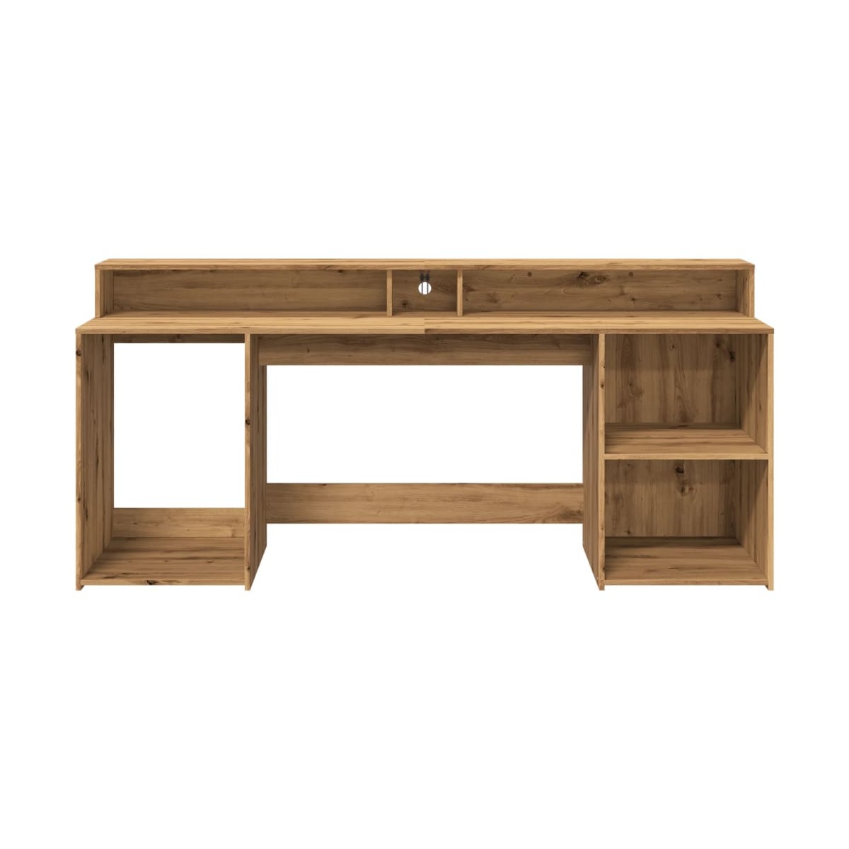 Con un amplio espacio de almacenamiento, una construcción duradera y opciones de iluminación LED, este escritorio es perfecto para crear un espacio de trabajo o de juego organizado y elegante. Material estable y duradero: La madera de ingeniería es un material duradero y estable con una superficie lisa que es resistente a la humedad, la deformación y la rotura, lo que la convierte en una opción fiable para varios proyectos.Luces LED RGB para un ambiente agradable: Este escritorio cuenta con luces LED que se pueden ajustar fácilmente para crear un espectáculo de luces personalizado. Puedes personalizar los modos, los colores y el brillo para mejorar el ambiente de tu espacio interior.Amplio espacio de almacenamiento: El escritorio incluye compartimentos y estantes abiertos, lo que ofrece amplias opciones de almacenamiento para todos los elementos esenciales de su oficina y ayuda a mantener tu espacio de trabajo organizado y ordenado.Fácil mantenimiento: Gracias a su superficie lisa, el escritorio con LED es fácil de limpiar con un paño seco y suave y requiere menos mantenimiento. Desconecta el producto de la fuente de alimentación o apaga la fuente de alimentación cuando la limpies y cuando no esté en uso. Advertencia:Para evitar que vuelque, este producto debe usarse con el dispositivo de fijación a la pared suministrado. Información útil:El producto tiene un conector USB que necesita una fuente de alimentación USB certificada de 5 V (no incluida).
